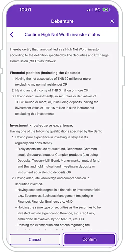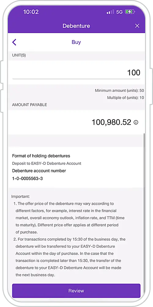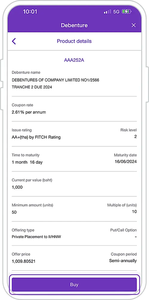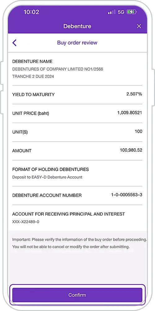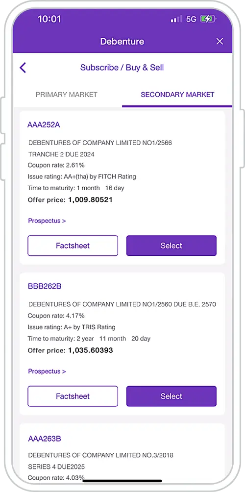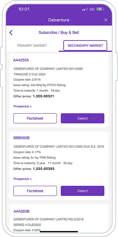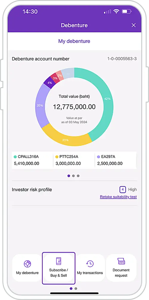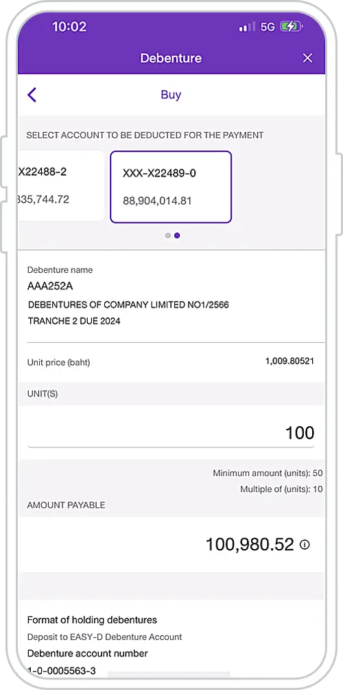 Buying corporate debentures via SCB EASY App is available everyday, 24 hours a day. Transactions are convenient, easy, and secure.