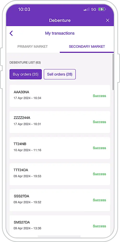 4. Choose tab “Secondary Market”. The screen will show the list of debentures that can be bought or sold. Select “Buy”
