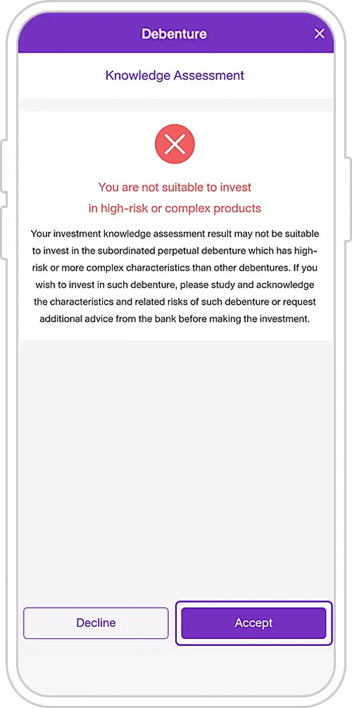 the system will display “You are not suitable to invest in products with high-risk or complex characteristics”.