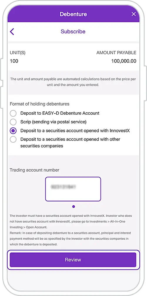 13. If investor selects “Deposit to a securities account opened with InnovestX”, then investor choose a securities account