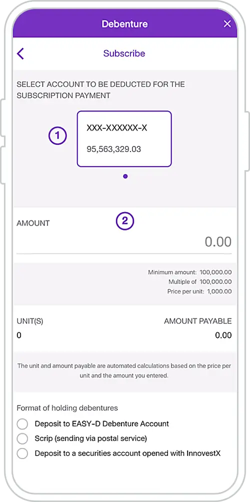 12. If investor selects “Scrip (sending via postal service)”, then customer choose a deposit account to receive the principal and interest for the debenture subscribed”