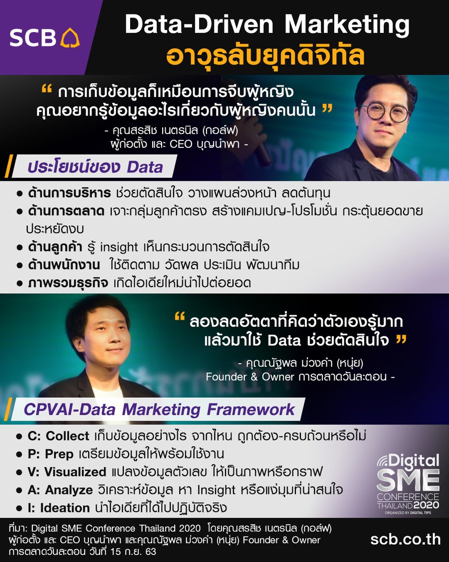 In an era that entrepreneurs need data to develop their business, some might have a question of what will come next after data collection, how to analyze information, and how much data needed to be collected to be sufficient. At Digital SME Conference Thailand 2020, Sorasich Natenin (Golf), Founder and CEO of Boonumpar who develop his business by using data to capture customers’ insight, was invited. He came up with ideas that led to the success and various expansion of his business such as “Boonumpar”, “Hong Catering”, “BNP Cuisine” and Mr.CHON. Another guest speaker is Nattapon Muangkham (Nui), Founder and Owner of EverydayMarketing.co, who is a marketing consultant, guest lecturer at university, and an author of the best-selling book titled “Data-Driven Marketing”. Both of them came to share their experiences from using data in the business to SME entrepreneurs as a starting idea to manage their own data.