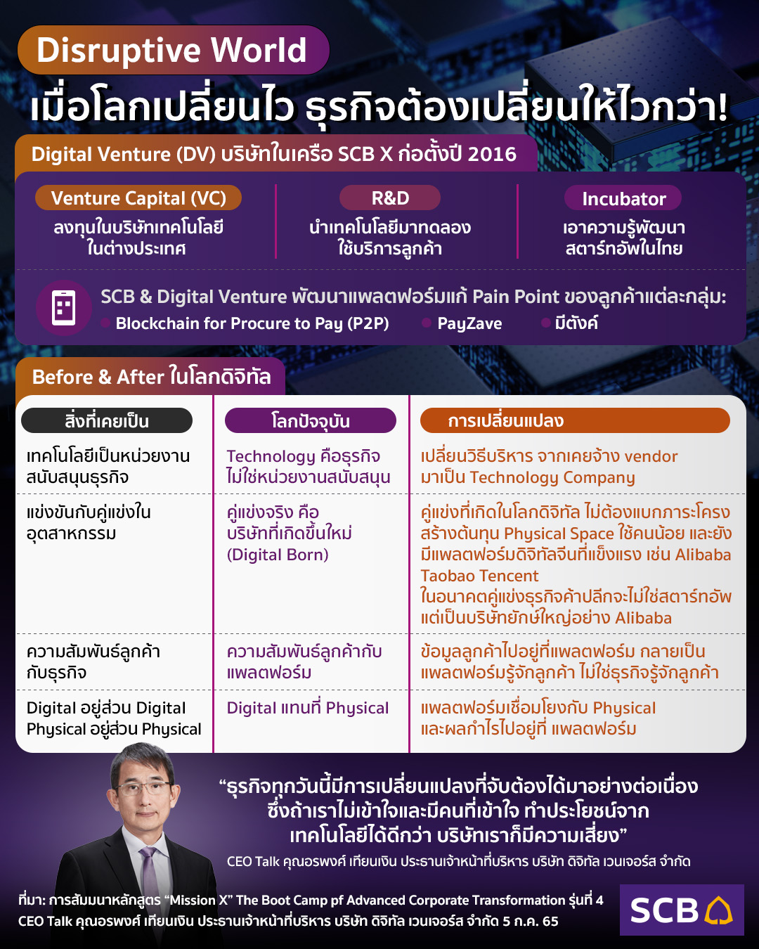 The reality of a disruptive world where technology has wiped out the business that once existed. Understanding the technology of the digital world that is happening. and will occur soon It will help entrepreneurs to know the direction to change their business to survive the change. Khun Orapong Thien-ngern, Chief Executive Officer of Digital Ventures Co., Ltd., shares executives' views on business in the digital world.