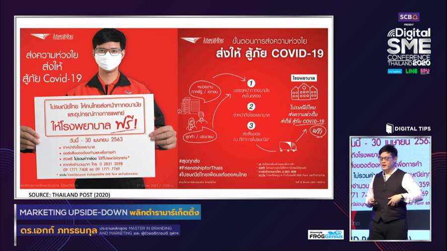 Because COVID changes society, everyone is afraid because they don't know what will happen next. Dr. Ake said that in the end, it is not possible to do business alone, but also to support society. Because SMEs are people who employ 85% of the total number of businesses, more than 90% of the country. For example, Thai Post Office In the past, many people sent donations to the hospital, so there was a promotion for free delivery, if the weight is less than 10 kilograms, the post will be picked up at home. Or Find Food in LINE MyShop during COVID, farmers do not sell mangoes, together with elephants lacking food So they brought mangoes and elephants to meet, and made a campaign to buy 10 kilograms of mangoes for the elephants to help the farmers help the elephants make agriculture to sell mangoes. Or Local.bkk Delivery helps the community is a gathering of the Sao Chingcha community and the Pratu Pee area without being deducted 30-35% to the food delivery platform. Living Business Concept Living Society SMEs can be used because it will make the business stay sustainable.
