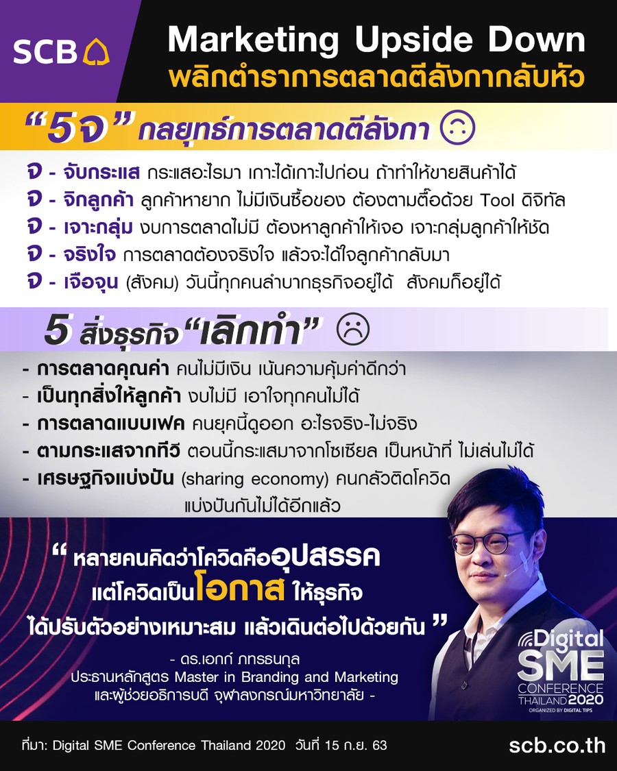 SMEs are the lifeblood of the Thai economy. Employers employ more than 85% of the country in the face of the COVID crisis, which is like a huge iceberg and must fight against economic stagnation Can't sell products because customers lack purchasing power. Plus, traditional marketing is not as working as before. Dr. Ake Patthanakul, Chair of the Master in Branding and Marketing Program and Assistant to the President Chulalongkorn University Shared experiences and turned the textbook upside down to find strategies to help Thai SMEs survive at the Digital SME Conference Thailand 2020.