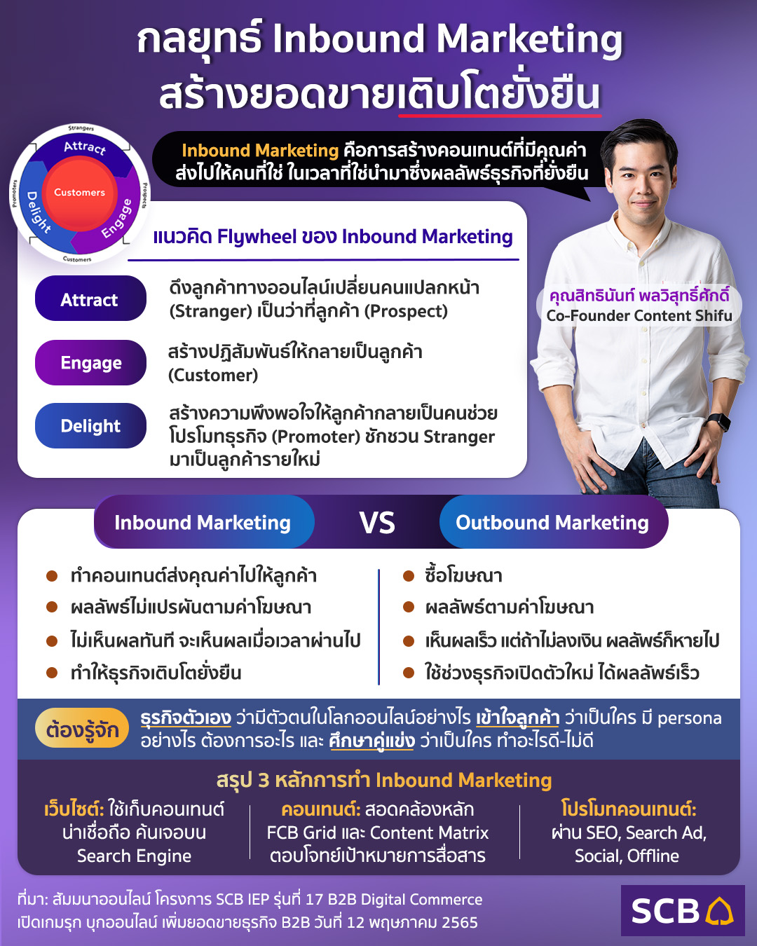 In the modern world, customers can choose to receive a variety of communications. Traditional B2B marketing tactics such as TV, radio, telephonic, booth, and email advertising are no longer as effective as they once were. Mr. Sitthinan Polvisutsak, Co-Founder Content Shifu reveals all the science of Inbound Marketing, an important marketing strategy that B2B businesses must do today.