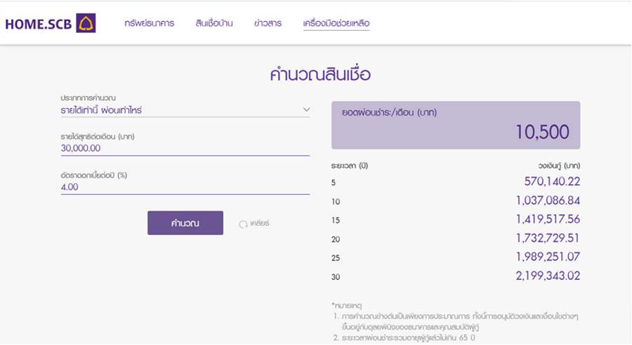 เมื่อเรารู้ความสามารถในการผ่อนชำระของตัวเอง ก็จะพอประเมินได้ว่าจะสามารถขอกู้ซื้อบ้านได้ที่วงเงินประมาณเท่าไหร่ ซึ่งสามารถใช้เว็บไซต์ของธนาคาร (เช่น https://asset.home.scb/calculate ) เป็นตัวช่วยในการคำนวณได้ โดยตัวเลขที่ต้องใส่คือ รายได้สุทธิต่อเดือน และอัตราดอกเบี้ยเงินกู้ต่อปี (ขอข้อมูลได้จากธนาคารที่เราต้องการขอสินเชื่อ) จะทำให้เราทราบจำนวนเงินที่ต้องผ่อนชำระต่อเดือน และวงเงินกู้โดยประมาณตามระยะเวลาที่เราต้องการผ่อนได้ ตามตัวอย่าง ดังนี้