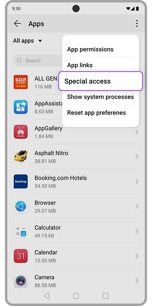 2. Select 3 dots icon on top right of screen > Select “Special access”