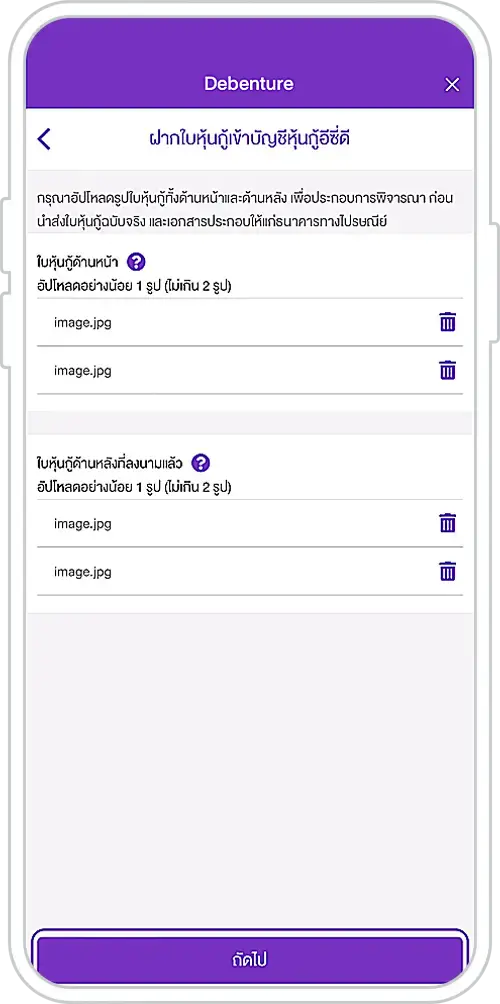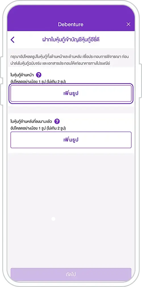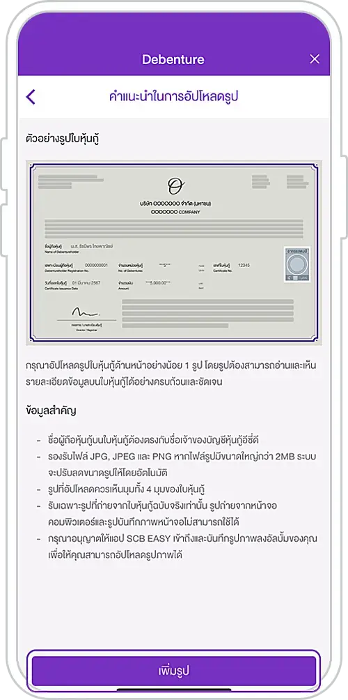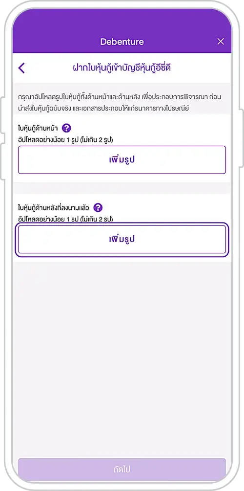 • Customer can deposit one debenture certificate per request and must upload the front-side and back-side of debenture certificate picture during making a request on SCB EASY App. Before uploading the back-side of debenture certificate picture, please sign under the transferor’s signature field and the signature must be matched with the signature on the copied of the identification card document.