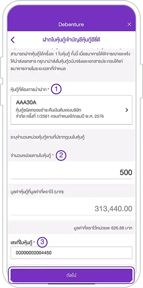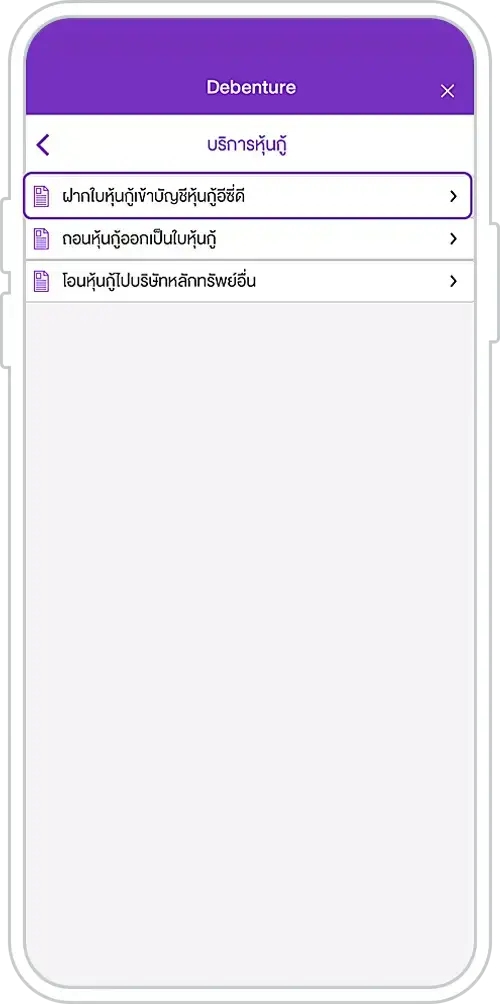 Convert your debenture certificates and deposit into the EASY-D Debenture Account in a scripless format. Allows you to check your debentures in one place. Submit debenture certificates deposit request via SCB EASY App throughout 24 hours a day or at any SCB branches during business hours.