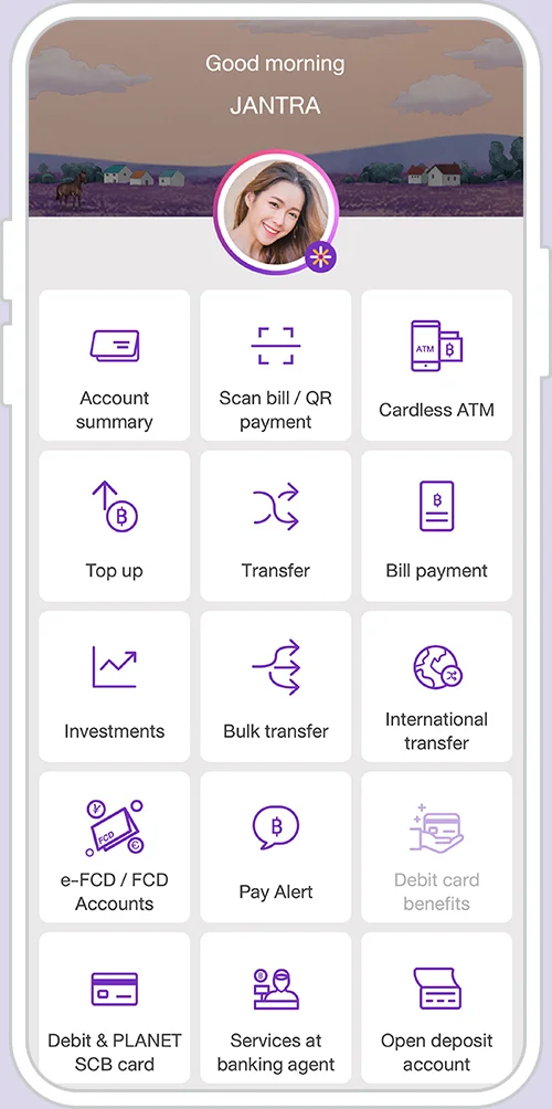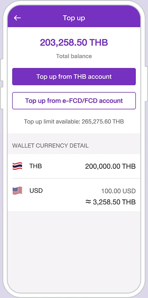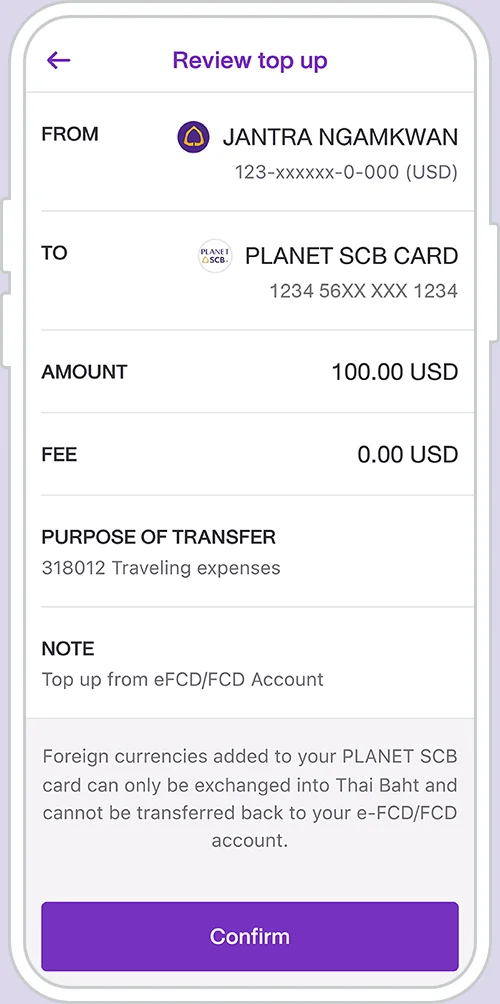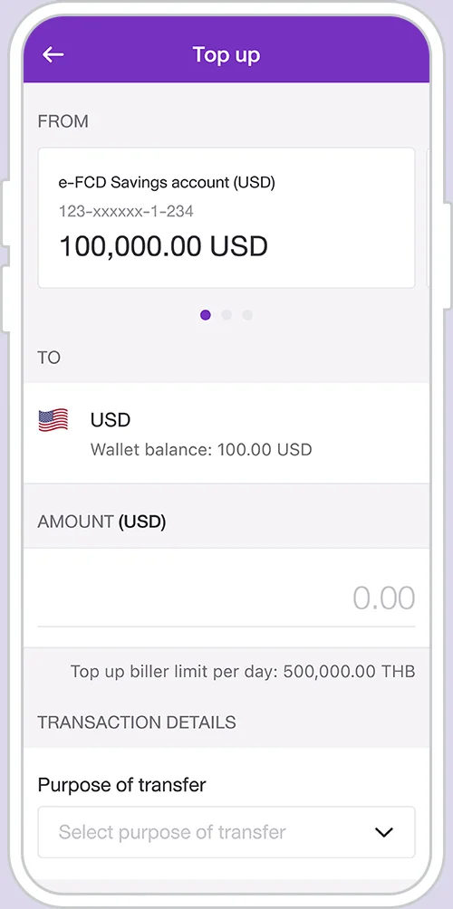 6. Select the “e-FCD/FCD Account to Top Up” and enter the foreign currency amount, select and confirm the purpose, and tap “Review.”