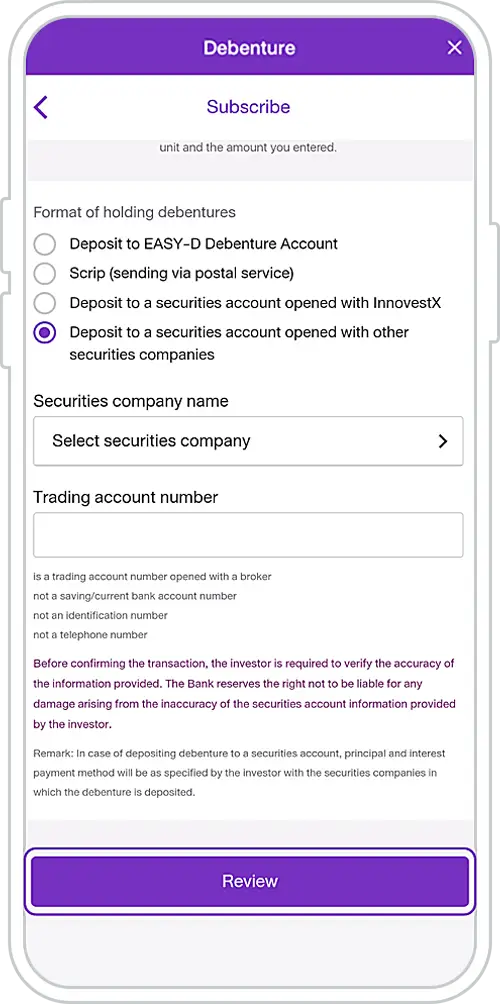 11. Choose format of holding debentures: If investor selects deposit debentures with SCB in the “EASY-D Debenture Account”, the system will automatically display debenture account number