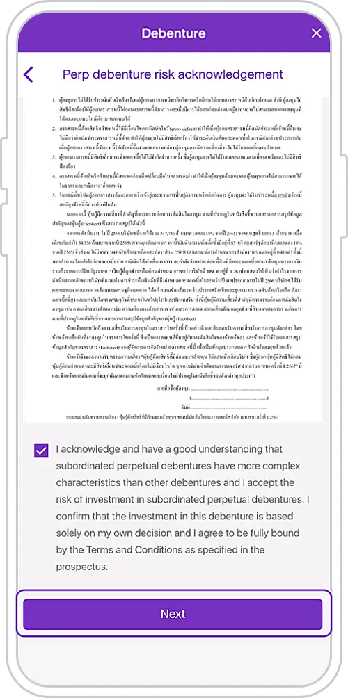 9. Study and accept the Perpetual Debenture Risk Acknowledgement Form and press “Next”