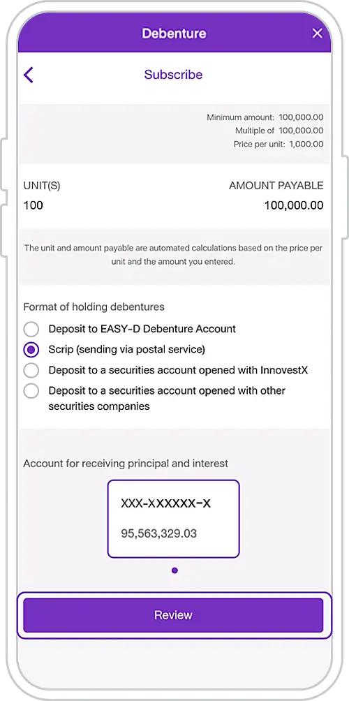 12. If investor selects “Scrip (sending via postal service)”, then customer choose a deposit account to receive the principal and interest for the debenture subscribed”