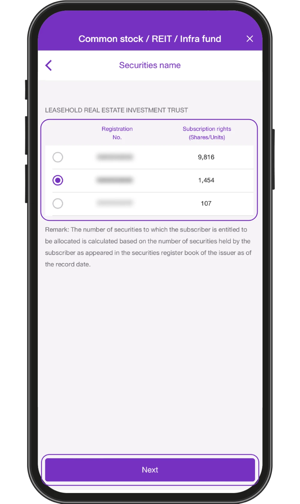 6. In the case of a preferential public offering or rights offering, existing security holders choose their registration number and subscription rights and press “Next”