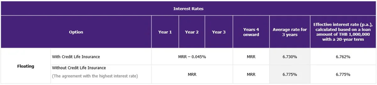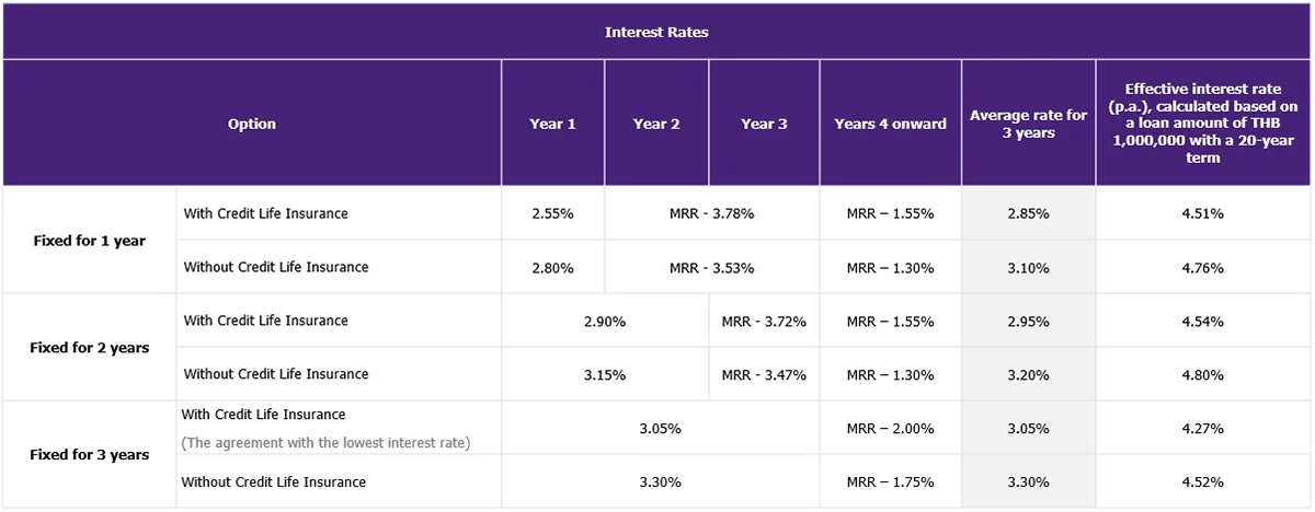 ***A loan amount is up to 100% of the collateral value based on either the collateral valuation or the purchase price stated in the Land Department’s sale contract, whichever is lower, for first homes priced under THB 10 million (Contract No. 1).