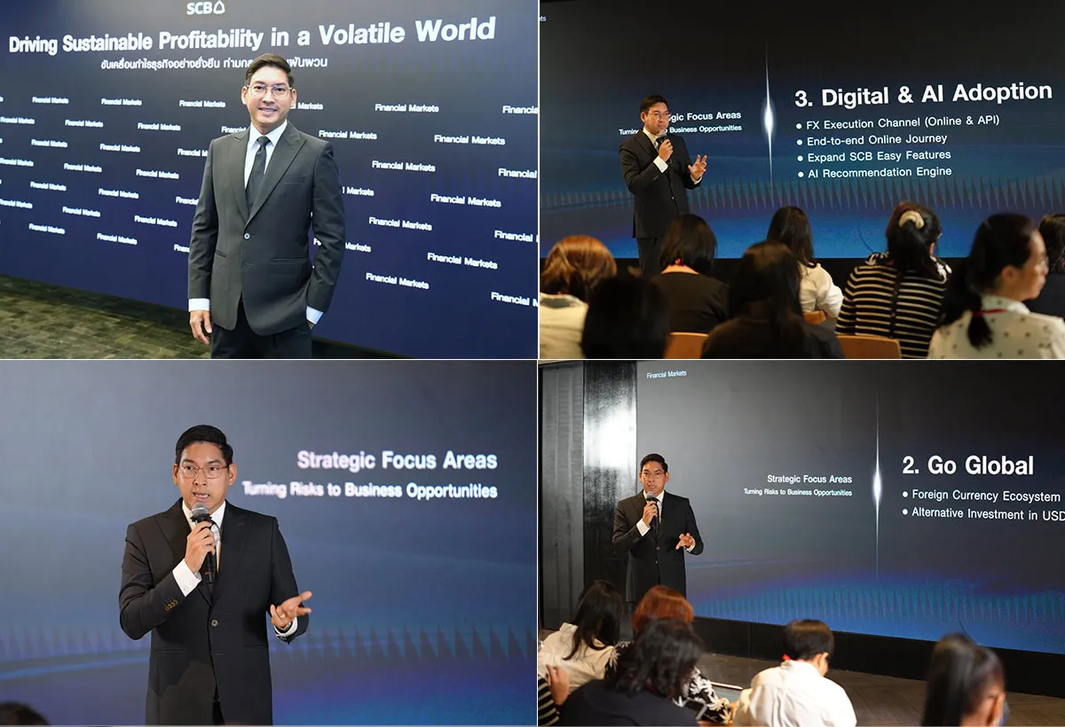นายแพททริก ปูเลีย รองผู้จัดการใหญ่ ผู้บริหารสายงาน Financial Markets ธนาคารไทยพาณิชย์ กล่าวว่า ค่าเงินบาทในปี 2568 แข็งค่ากว่า 8% ต่อปี และความผันผวนสูงกว่าในอดีต ซึ่งส่งผลกระทบต่อรายได้ของผู้ส่งออกไทย และมีนัยต่อ GDP ของประเทศ ดังนั้นในปีที่ผ่านมาจึงเห็นผู้ประกอบการไทยตระหนักถึงการป้องกันความเสี่ยงจากอัตราแลกเปลี่ยนมากขึ้นสะท้อนจากปริมาณธุรกรรมทั้งการสัญญาซื้อขายล่วงหน้า (Forward Contract) และสัญญาออปชั่น (Options) ของ SCBFM เพิ่มขึ้น โดยคิดเป็นสัดส่วนกว่า 60% ของปริมาณธุรกรรม FX ทั้งหมด นอกจากนี้ ธนาคารยังส่งเสริมแนวคิดการกระจายความเสี่ยงด้านสกุลเงิน (Currency Diversification) เพื่อลดการพึ่งพาสกุลเงินใดสกุลเงินหนึ่งเพียงอย่างเดียว ช่วยเลี่ยงผลกระทบจากความผันผวนของเงินสกุลเงินดอลลาร์สหรัฐฯ ให้ผู้ประกอบการบริหารจัดการต้นทุนและรายได้อย่างมีเสถียรภาพมากขึ้น