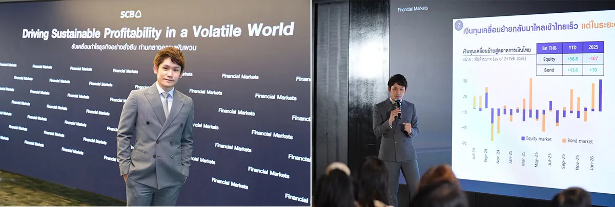 ธนาคารไทยพาณิชย์มองปี 2569 เป็นปีที่ภาคธุรกิจไทยยังคงต้องเผชิญกับความท้าทายจากความผันผวนของตลาดการเงินโลก มองเงินบาทแข็งค่ายังสร้างแรงกดดันหลักต่อภาคส่งออกที่เป็นเครื่องยนต์หลักของเศรษฐกิจไทย พร้อมเดินหน้าต่อยอดบทบาทกลุ่มงานตลาดการเงิน SCB Financial Markets (SCBFM) เป็นที่ปรึกษาบริหารความเสี่ยงทางการเงินเชิงกลยุทธ์ ช่วยออกแบบการบริหารความเสี่ยงให้สอดคล้องกับเป้าหมายทางการเงินและเสริมความสามารถในการทำกำไรของธุรกิจ เผยปี 2568 ลูกค้าเห็นประโยชน์จากการป้องกันความเสี่ยงมากขึ้น สะท้อนความสำเร็จการเป็นที่ปรึกษาเชิงกลยุทธ์ที่ช่วยลูกค้าบริหารความเสี่ยงได้ดีแม้บาทแข็ง ตั้งเป้าหนุนลูกค้าธุรกิจเพิ่มระดับสัดส่วนการป้องกันความเสี่ยงในระดับ 70 - 80% ด้านค่าเงินในช่วง 1-2 เดือนนี้ประเมินอยู่ในกรอบ 31.00-32.00 บาทต่อดอลลาร์สหรัฐ