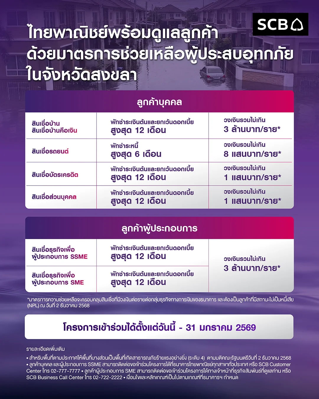 | สินเชื่อธุรกิจเพื่อผู้ประกอบการ SSME / สินเชื่อธุรกิจเพื่อผู้ประกอบการ SME | พักชำระเงินต้นและยกเว้นดอกเบี้ยสูงสุด 12 เดือน |