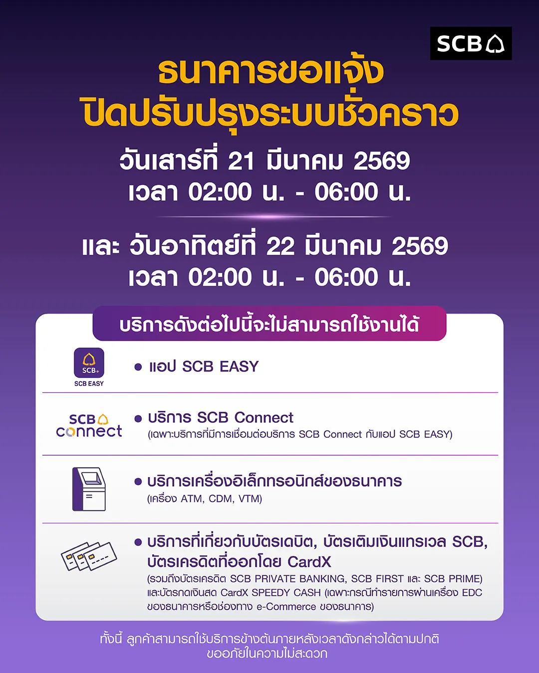 | วันเสาร์ที่ 21 มีนาคม 2569 เวลา 02:00 น. ถึง 06:00 น. | ลูกค้าไม่สามารถใช้บริการดังต่อไปนี้ได้