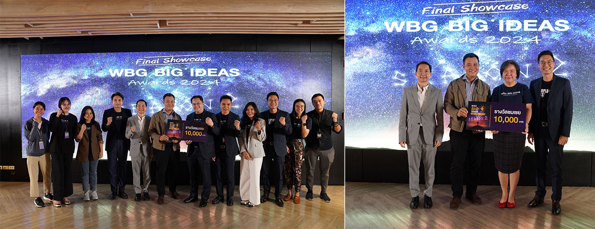สำหรับทีมที่รับรางวัลชนะเลิศ WBG Big Ideas Awards 2024 #Season 2 ได้แก่ โครงการDAB Phase II ลดงาน ลดค่าใช้จ่าย รางวัลรองชนะเลิศอันดับ 1 ได้แก่ โครงการ LG Collaborate รางวัลรองชนะเลิศอันดับ 2 ได้แก่ โครงการ e-Bank Confirmation (eBC) หรือ Audit confirmation letter (ACL) รางวัลชมเชย ได้แก่ โครงการ Better Customer Experience Powered by AI และ Team Building on on off off line