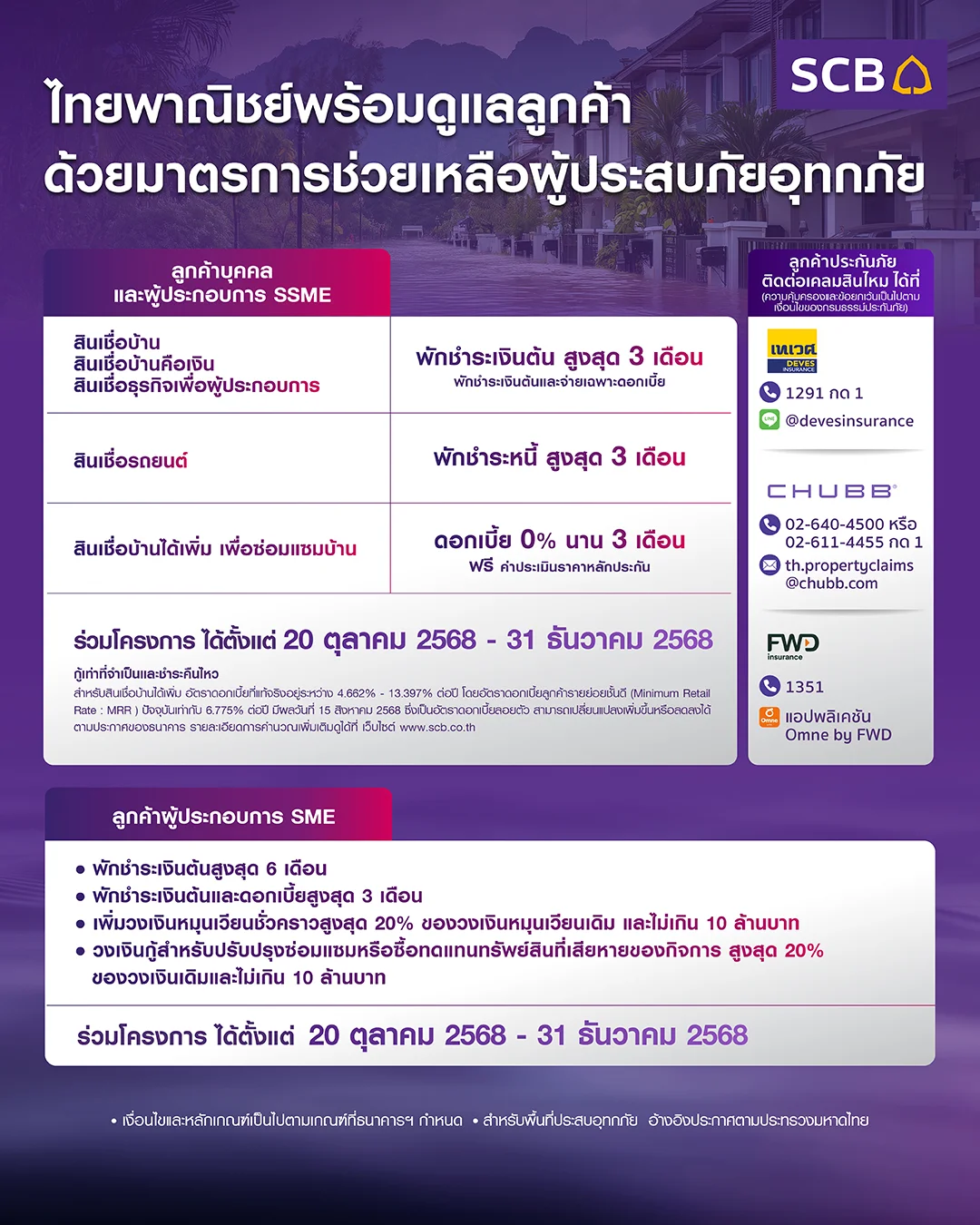 ลูกค้าสามารถติดต่อขอเข้าร่วมโครงการได้ที่ธนาคารไทยพาณิชย์ทุกสาขาทั่วประเทศ หรือ SCB Customer Center โทร 02-777-7777 ได้ตั้งแต่วันที่ 20 ตุลาคม 2568 – 31 ธันวาคม 2568
