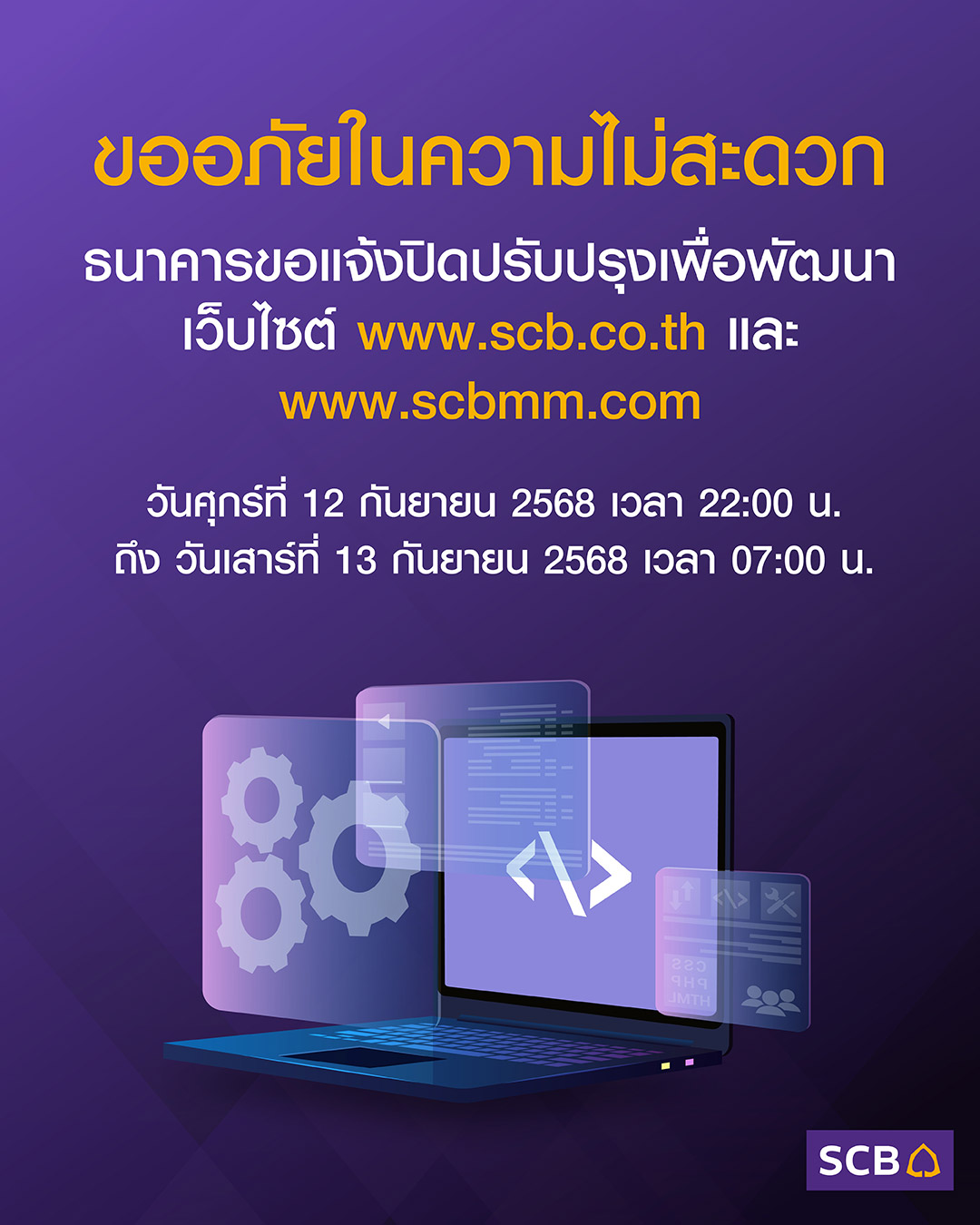 แจ้งปิดปรับปรุงเว็บไซต์ SCB.CO.TH และ SCBMM.COM ตั้งแต่วันศุกร์ที่ 12 กันยายน 2568 เวลา 22:00 น. ถึงวันเสาร์ที่ 13 กันยายน 2568 เวลา 7:00 น.