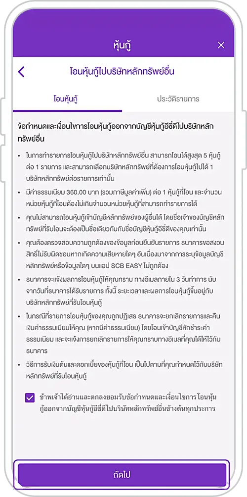 ข้อกำหนดและเงื่อนไขการโอนหุ้นกู้ออกจากบัญชีหุ้นกู้อีซี่ดีไปบริษัทหลักทรัพย์อื่น ผ่านแอป SCB EASY