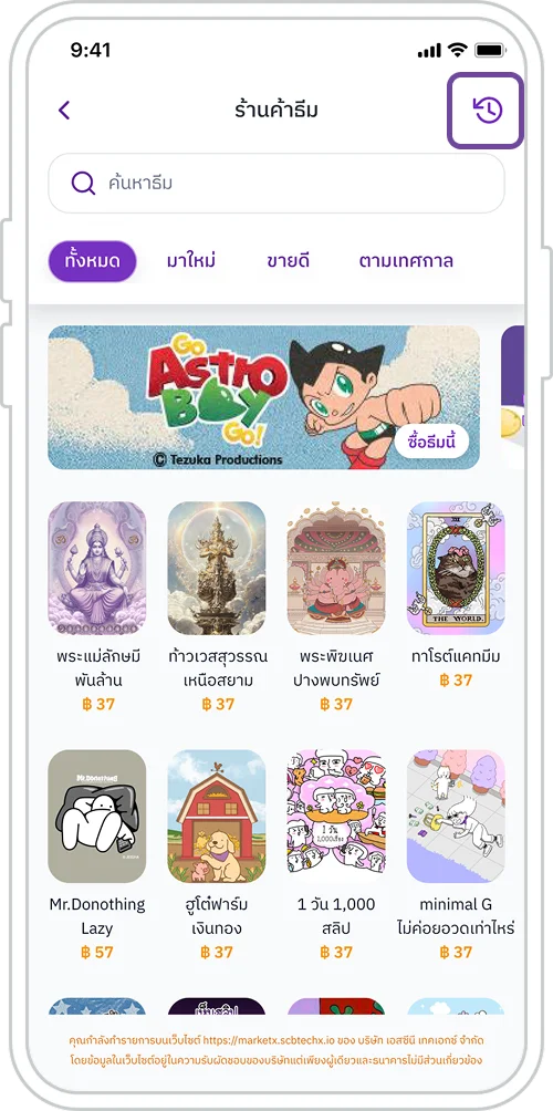 1. กดที่ไอคอนนาฬิกาที่มุมขวาบนเพื่อดูประวัติการซื้อธีม