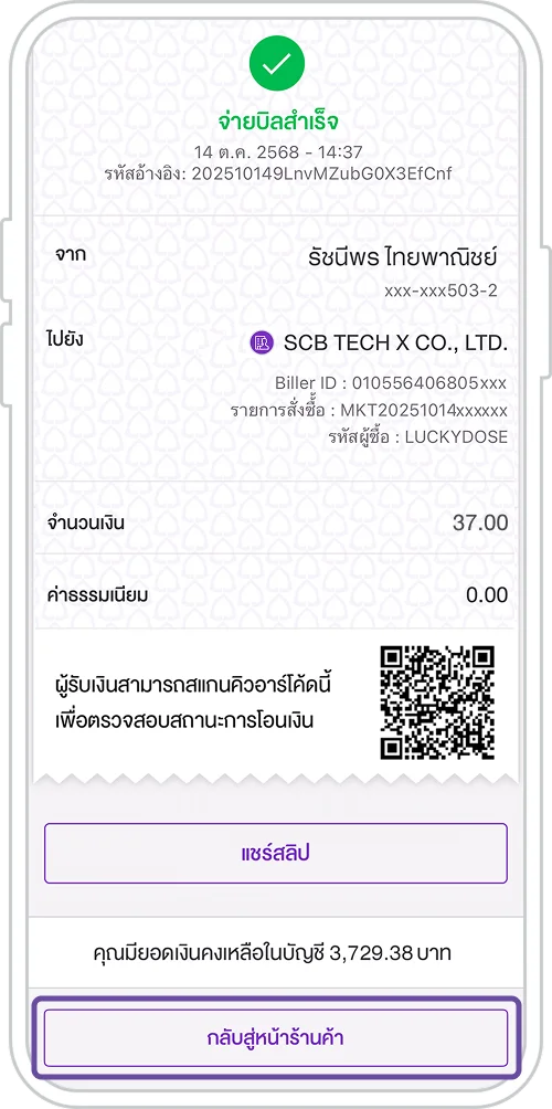 9. จ่ายบิลสำเร็จ และกด "กลับสู่หน้าร้านค้า“ เพื่อใช้งานธีมที่ซื้อ