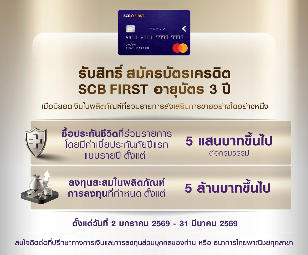ทั้งนี้ ลูกค้าสามารถศึกษารายละเอียดในการขอสมัครใช้บริการบัตรเครดิต SCB FIRST ได้ที่เว็บไซด์ www.scb.co.th/th/personal-banking/investment/fund/mutual-funds/signupto-scbfirst1q26 หรือติดต่อเจ้าหน้าที่ธนาคารที่ดูแลลูกค้า