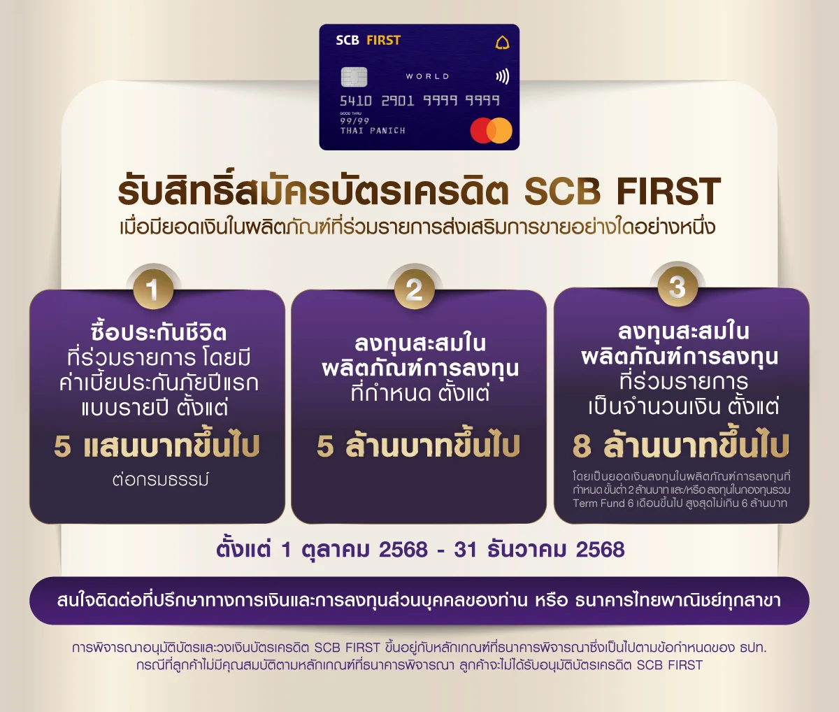 | ผลิตภัณฑ์การลงทุนที่กำหนด (3) | 2.2 ลูกค้ามียอดเงินลงทุนสะสมจากการซื้อหน่วยลงทุน หรือสับเปลี่ยนหน่วยลงทุนเข้าในกองทุนรวมที่เข้าร่วมรายการส่งเสริมการขายนี้ และ/หรือมียอดรวมของมูลค่ารวมที่ตราไว้ (Total Nominal Amount) ของผลิตภัณฑ์หุ้นกู้ที่มีอนุพันธ์แฝงที่ออกโดยธนาคาร และ/หรือที่จำหน่ายโดยบริษัทหลักทรัพย์ อินโนเวสท์ เอกซ์ จำกัด (“InnovestX”) ซึ่งเข้าร่วมรายการส่งเสริมการขายนี้ และลูกค้าได้ซื้อผ่านช่องทางของธนาคาร เป็นจำนวนเงินตั้งแต่ 5,000,000 บาทขึ้นไป | อายุบัตร 2 ปี (ใช้เอกสิทธิ์ได้เมื่อมีสินทรัพย์รวมกับธนาคาร** เฉลี่ย 6 เดือน ตั้งแต่ 5 ล้านบาทขึ้นไป) |