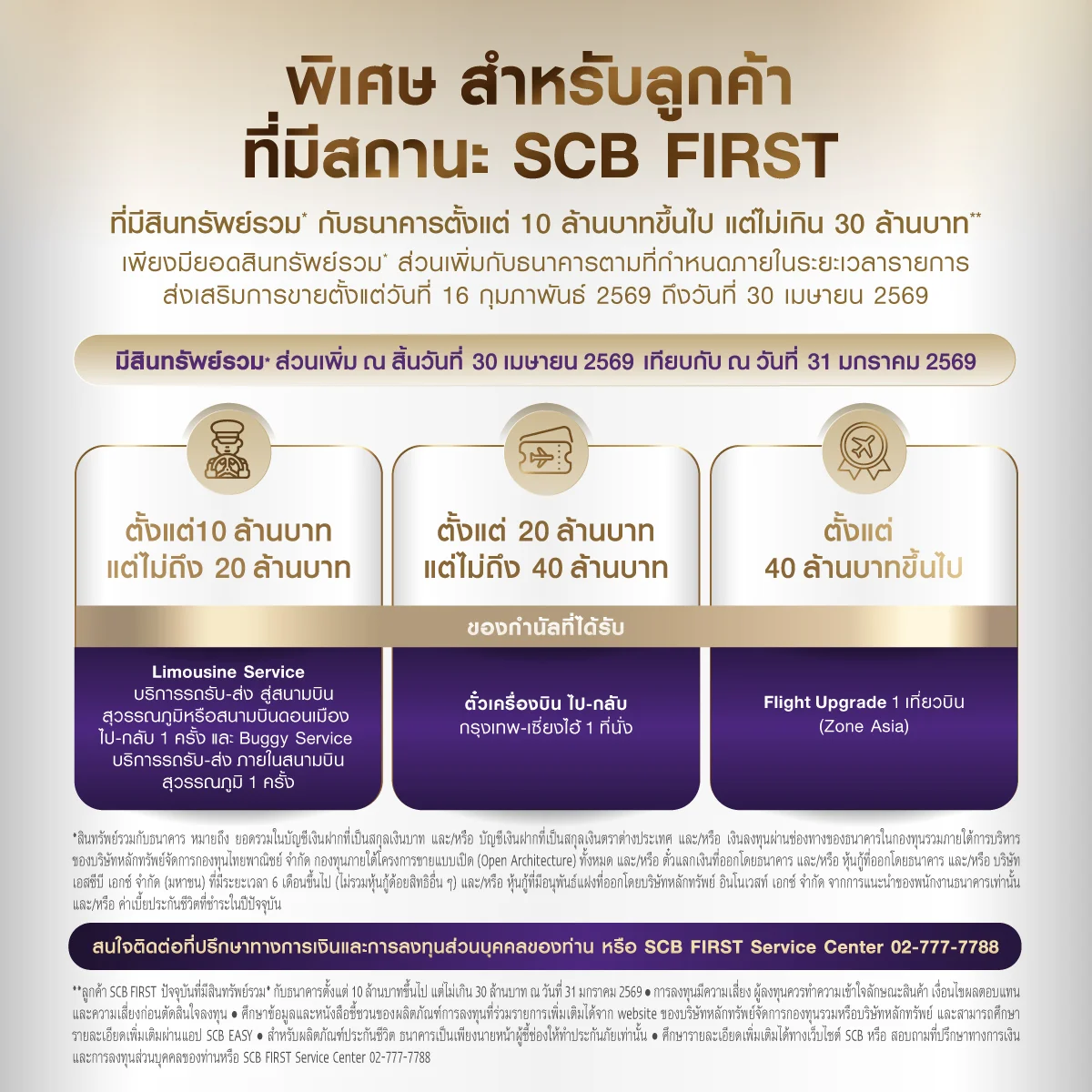 *สินทรัพย์รวมกับธนาคาร หมายถึง ยอดรวมในบัญชีเงินฝากที่เป็นสกุลเงินบาท และ/หรือบัญชีเงินฝากที่เป็นสกุลเงินตราต่างประเทศ และ/หรือเงินลงทุนผ่านช่องทางของธนาคารในกองทุนรวมภายใต้การบริหารของบริษัทหลักทรัพย์จัดการกองทุนไทยพาณิชย์ จำกัด กองทุนภายใต้โครงการขายแบบเปิด (Open Architecture) ทั้งหมด และ/หรือตั๋วแลกเงินที่ออกโดยธนาคาร และ/หรือหุ้นกู้ที่ออกโดยธนาคาร และ/หรือบริษัท เอสซีบี เอกซ์ จำกัด (มหาชน) ที่มีระยะเวลา 6 เดือนขึ้นไป (ไม่รวมหุ้นกู้ด้อยสิทธิอื่น ๆ) และ/หรือ หุ้นกู้ที่มีอนุพันธ์แฝงที่ออกโดยบริษัทหลักทรัพย์ อินโนเวสท์ เอกซ์ จำกัด จากการแนะนำของพนักงานธนาคารเท่านั้น และ/หรือค่าเบี้ยประกันชีวิตที่ชำระในปีปัจจุบัน