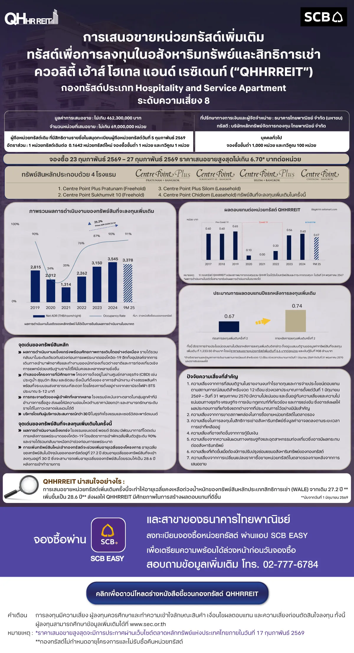 สำหรับผลการดำเนินงานของ QHHRREIT ในช่วง 9 เดือนแรกของ 2568 เติบโตอย่างต่อเนื่อง รายได้เฉลี่ยต่อห้องพักปรับตัวเพิ่มขึ้นจากความต้องการที่ยังคงอยู่ในระดับสูง อัตราการเข้าพักเฉลี่ยของทรัพย์สินปัจจุบันอยู่ที่ 87% ซึ่งใกล้เคียงกับก่อนโควิด-19 สะท้อนให้เห็นถึงการฟื้นตัวและการได้รับปัจจัยบวกจากการท่องเที่ยวของไทยที่เติบโตได้ดี โดย 9 เดือนแรกของ 2568 กองทรัสต์จ่ายปันผลจากการดำเนินงานไปแล้วรวม 0.47 บาทต่อหน่วย