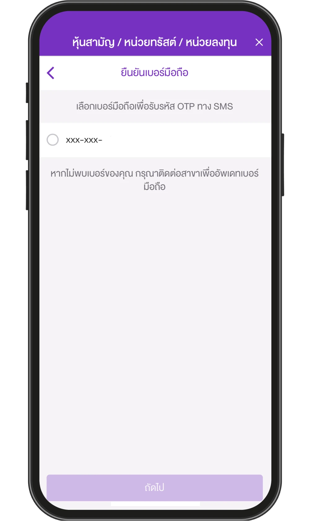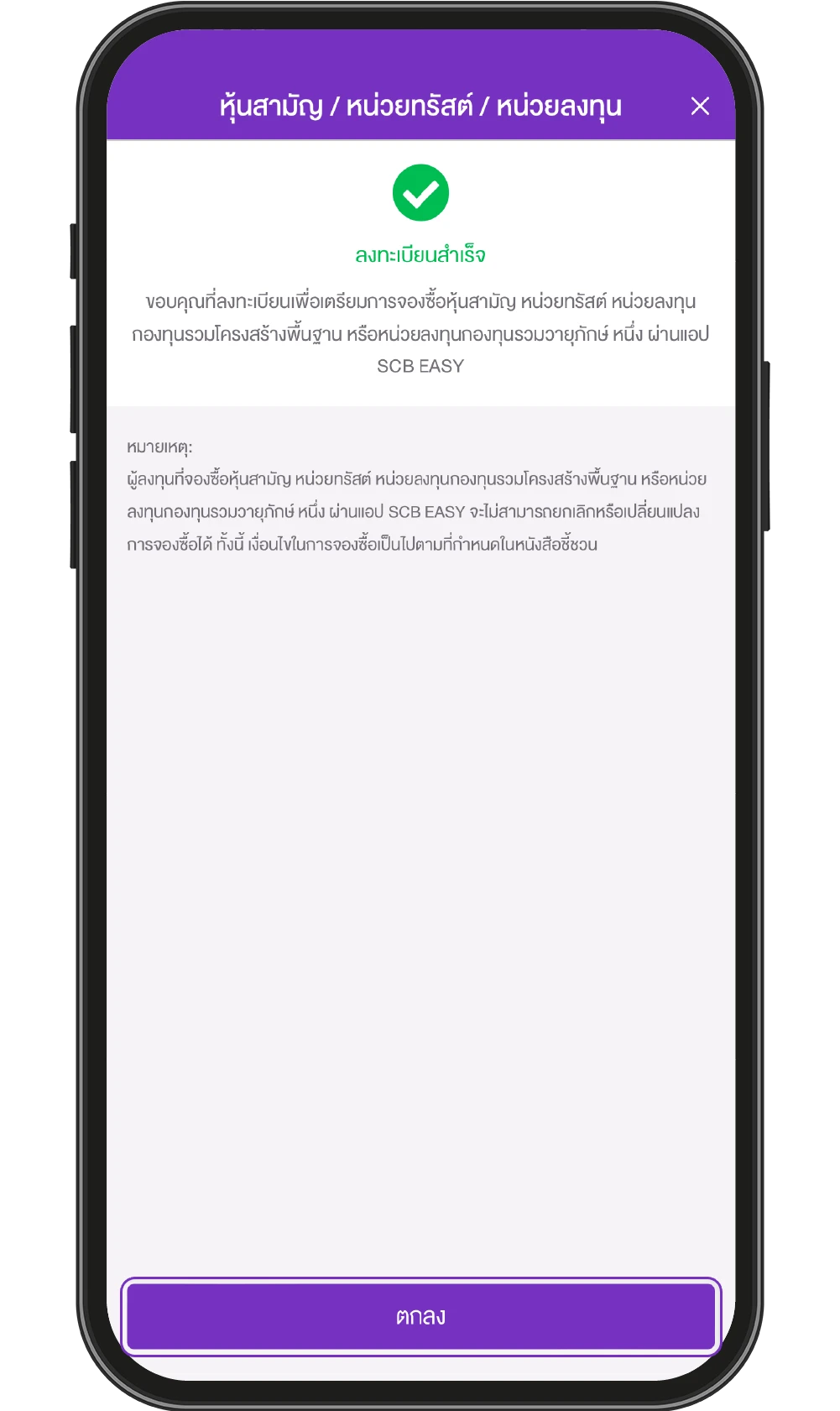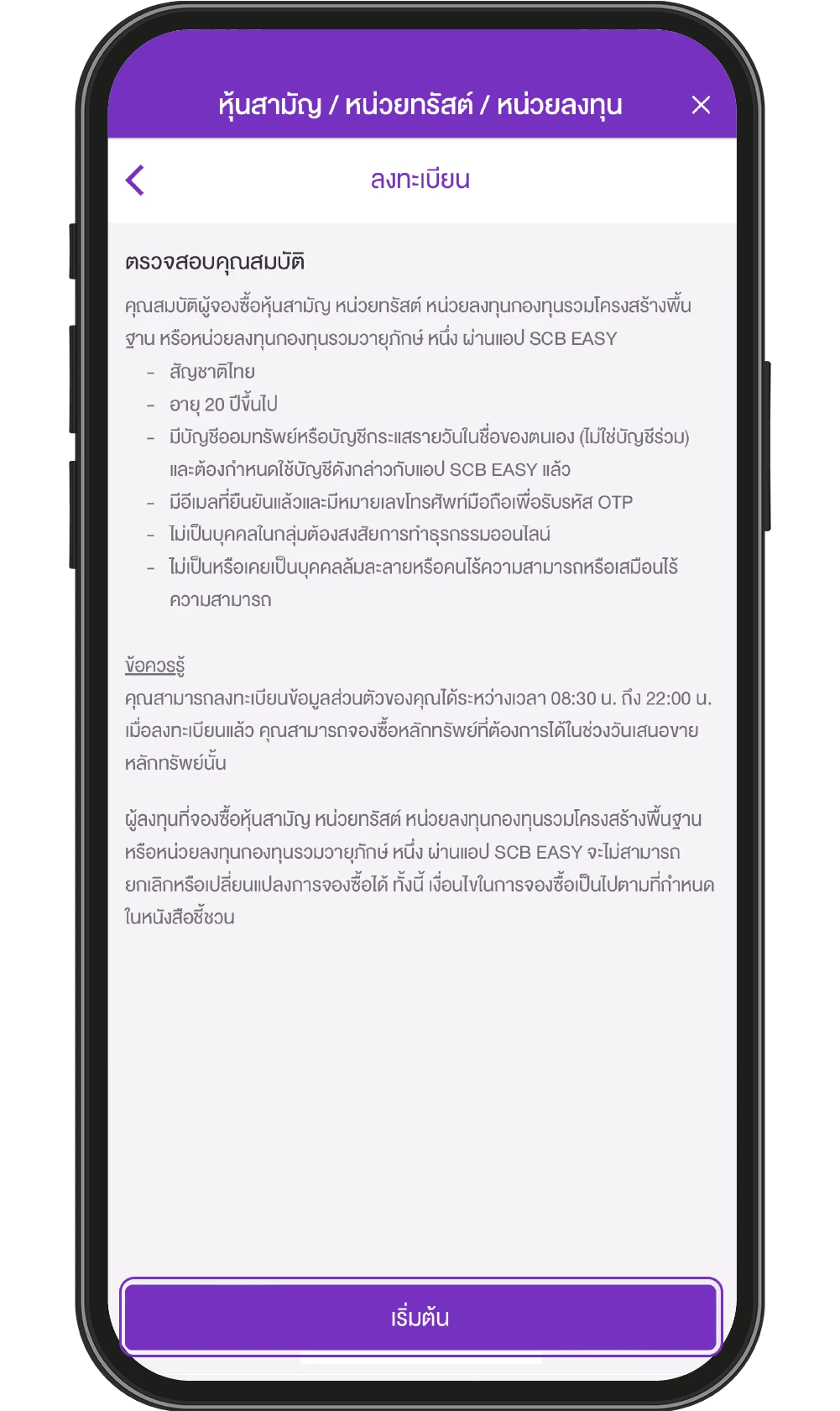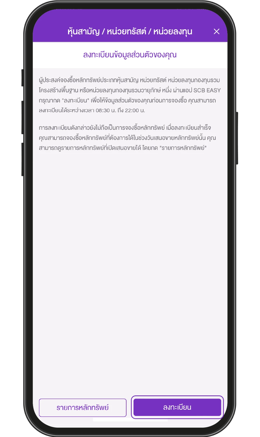 • สำหรับลูกค้าใหม่ ลงทะเบียนเพียงครั้งแรกครั้งเดียวเพื่อบันทึกหรือตรวจสอบข้อมูลส่วนตัว ก่อนจองซื้อ หุ้นสามัญ/ หน่วยทรัสต์/ หน่วยลงทุนผ่านแอป SCB EASY