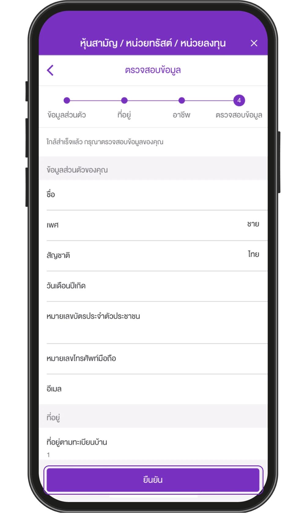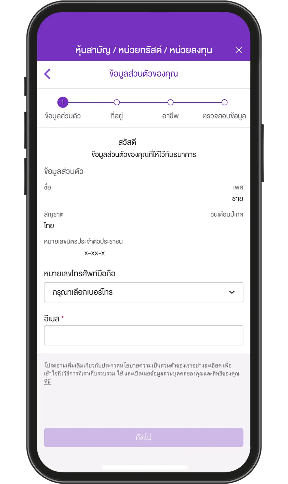 ลงทะเบียนง่าย เพียงครั้งแรกครั้งเดียว เพื่อให้ข้อมูลส่วนตัวก่อนการจองซื้อหุ้นสามัญ หน่วยทรัสต์ หน่วยลงทุนกองทุนรวมโครงสร้างพื้นฐานผ่านแอป SCB EASY