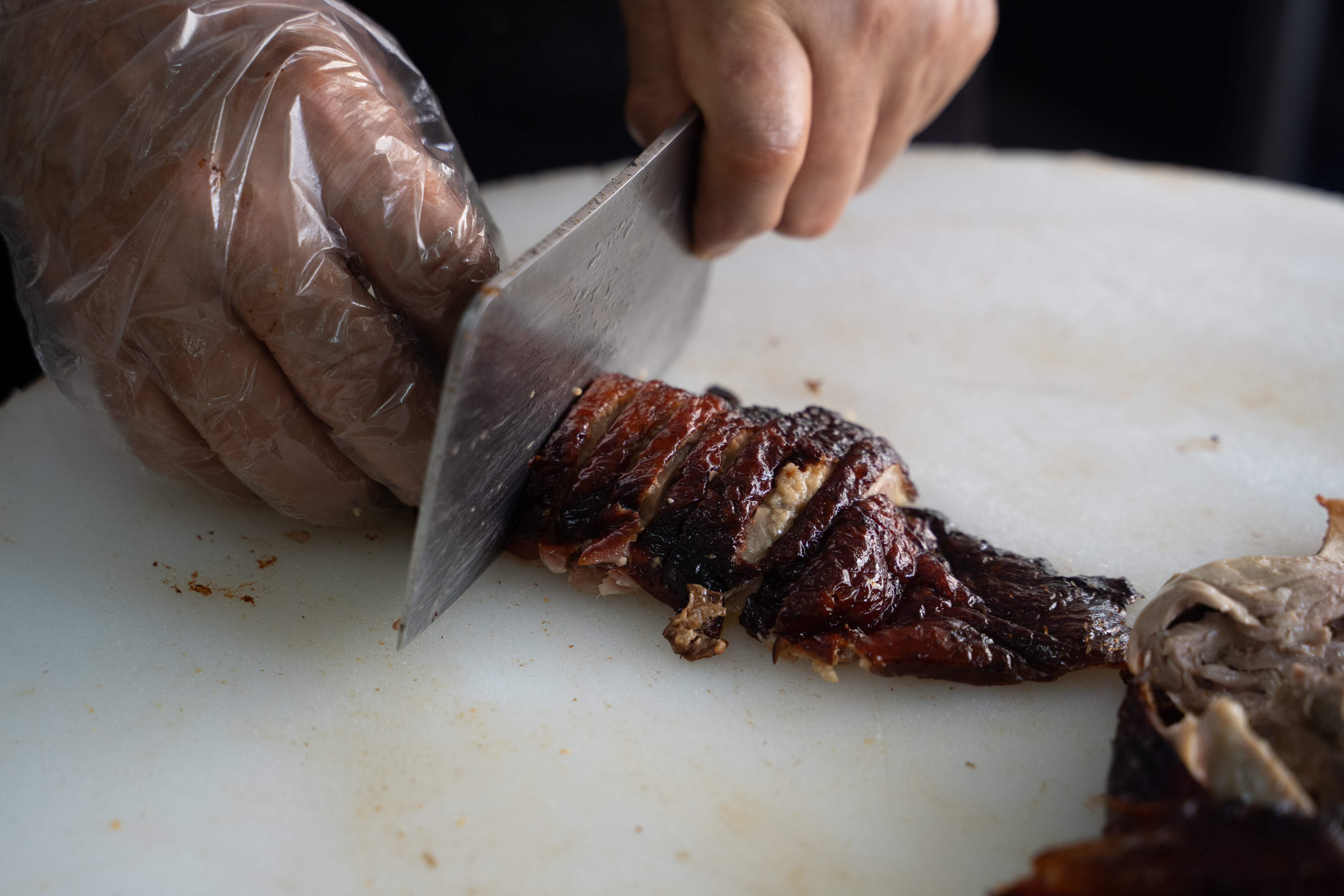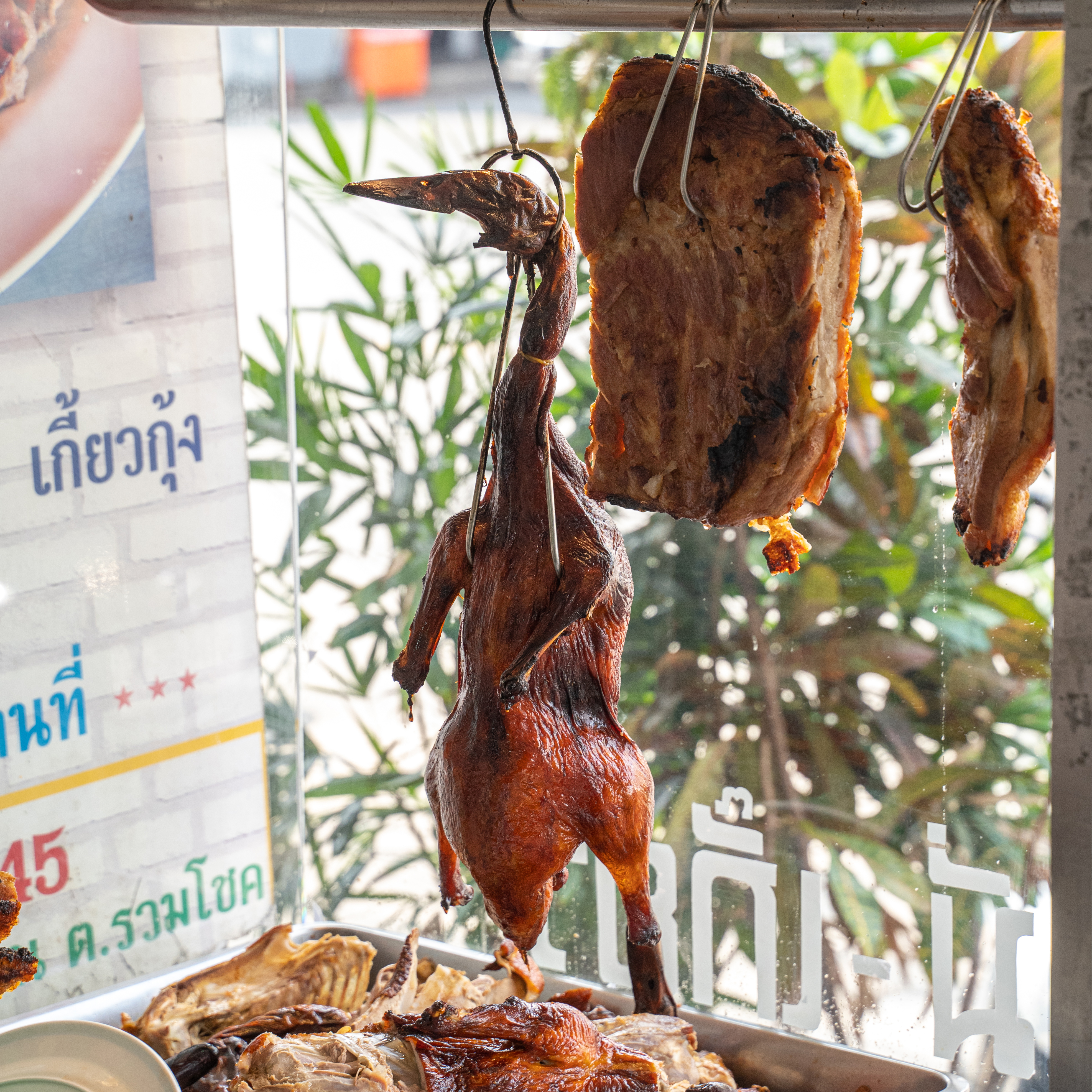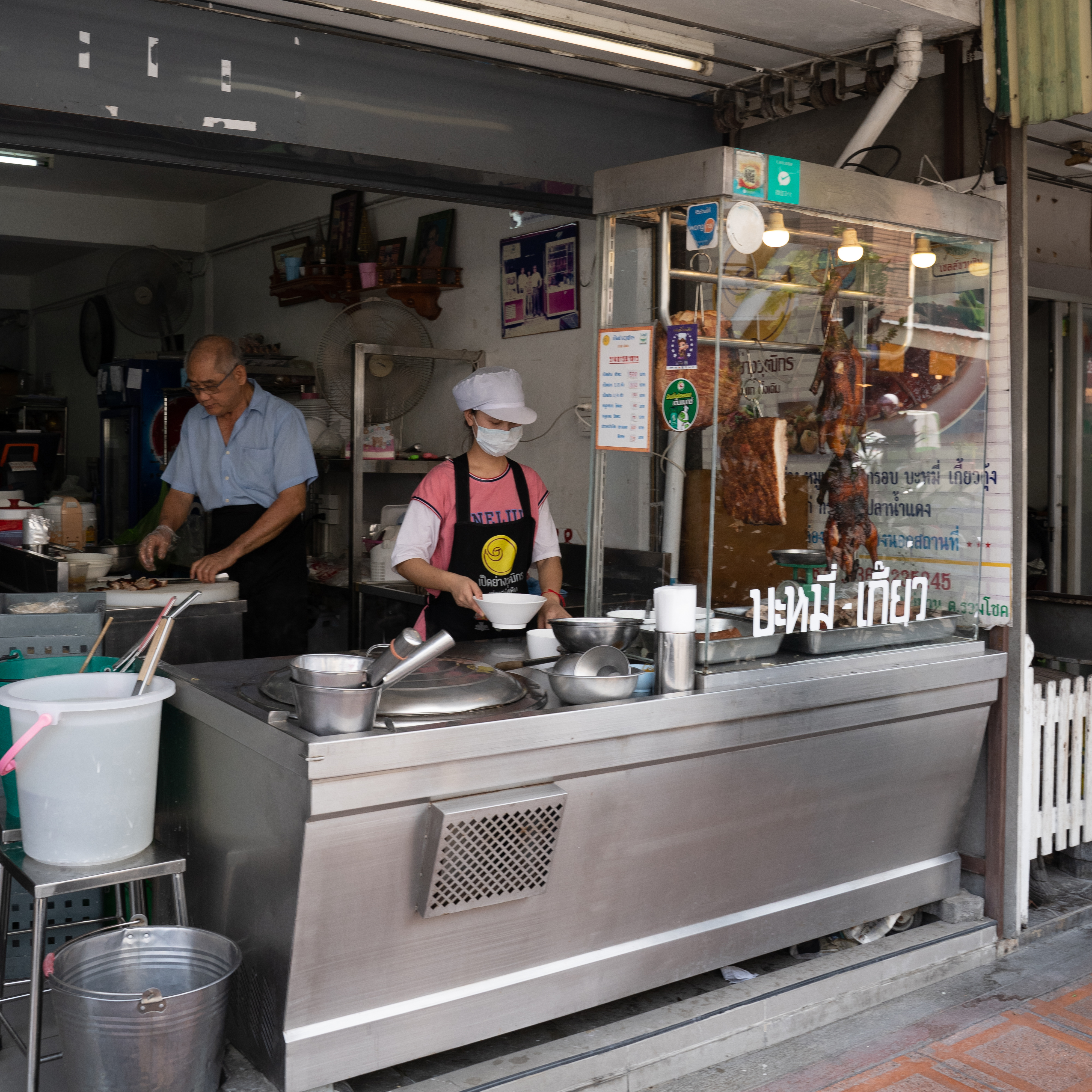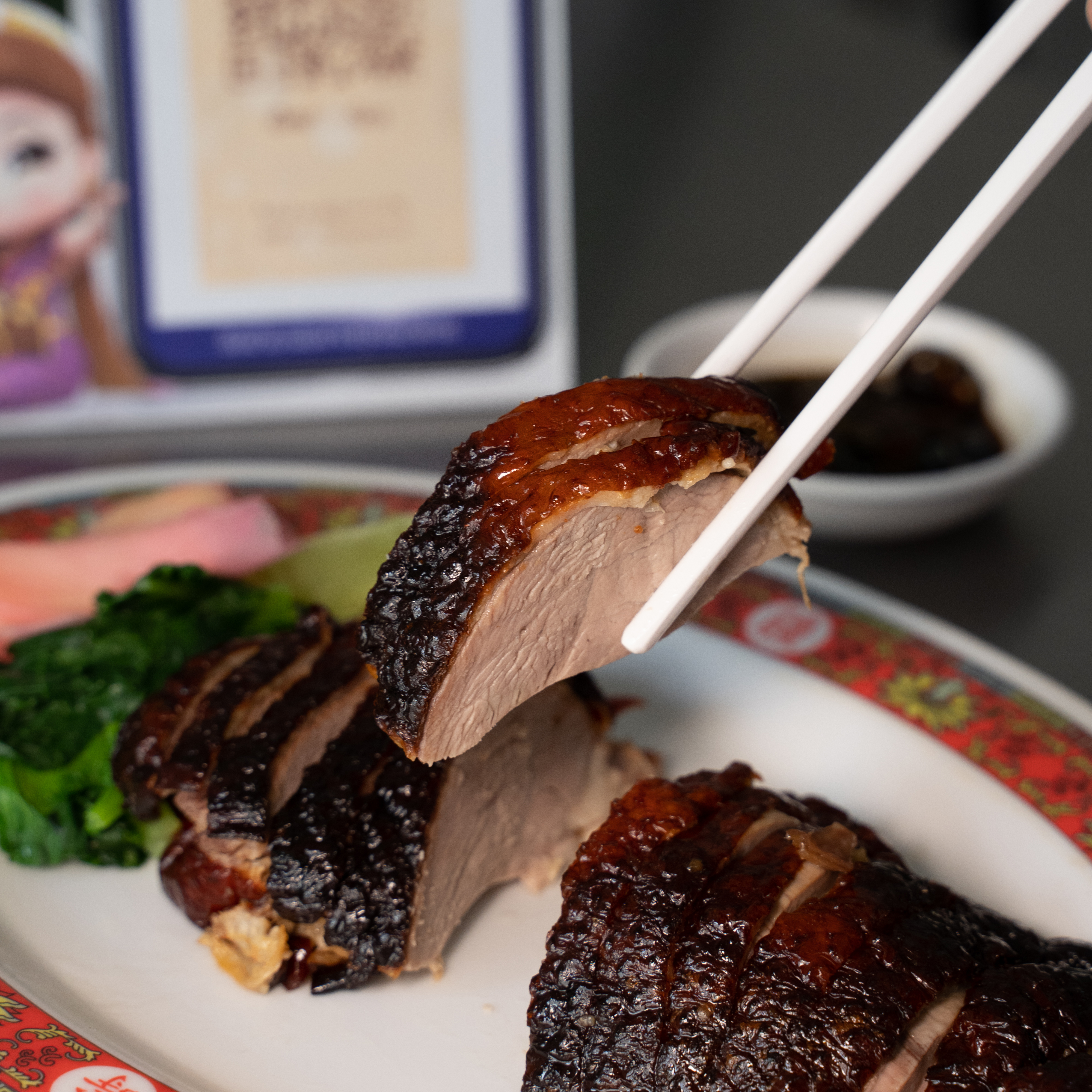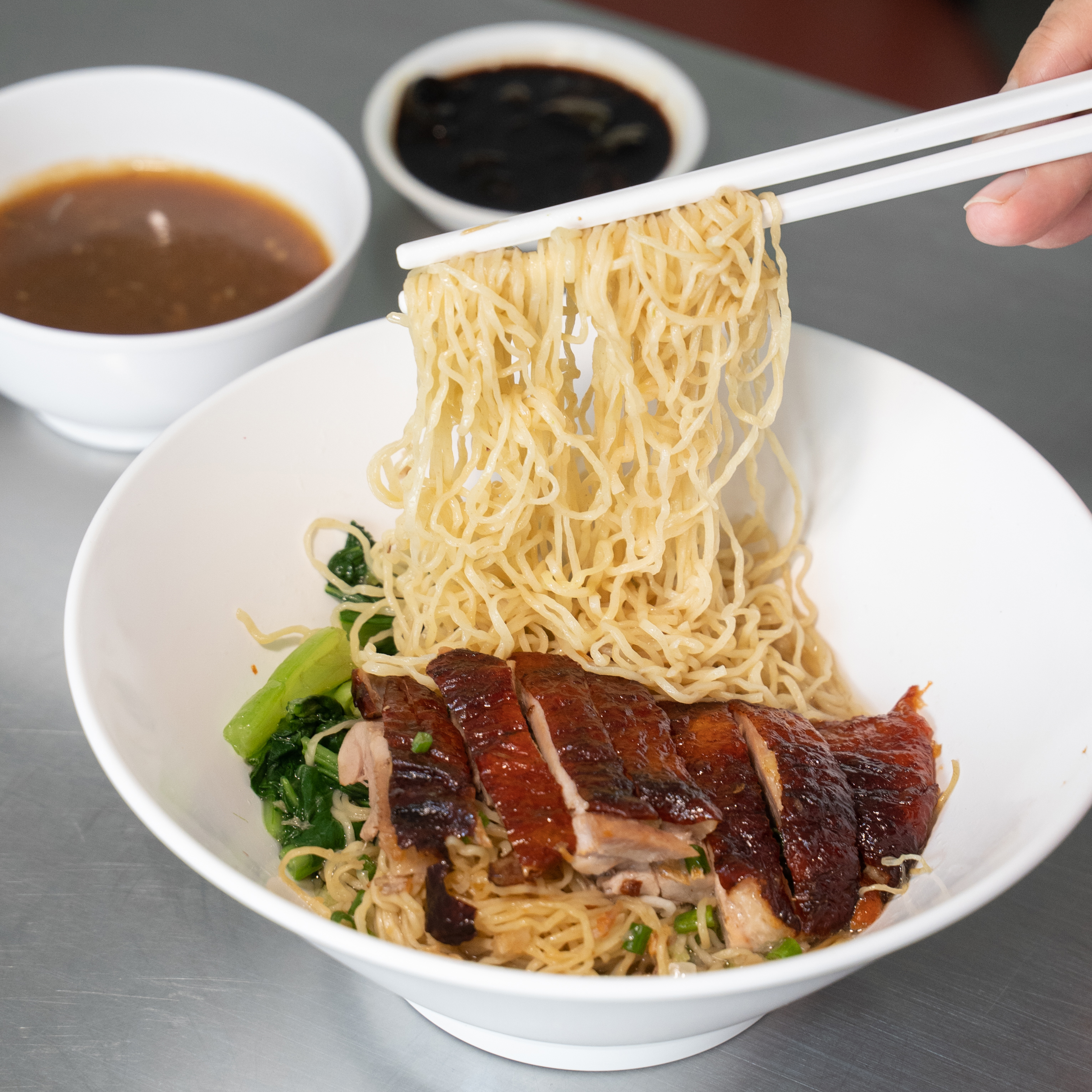 สาวกเป็ดย่างพลาดไม่ได้ กับเนื้อเป็ดที่มีความแน่นแต่นุ่ม ไม่เหนียว เคี้ยวง่าย ส่วนหนังมีความบางกรอบกำลังดี เนื่องจากผ่านการอบด้วยน้ำผึ้งสูตรดั้งเดิมของทางร้าน ทำให้ได้รสชาติที่อร่อยลงตัว หมูกรอบไม่แข็ง เคี้ยวเพลิน แถมมันไม่เยอะ กินแล้วไม่เลี่ยน แต่เกลี้ยงจานแน่นอน ในส่วนของเมนู ก็มีให้เลือกทั้งข้าวและเส้น ซึ่งเมนูแรกที่อยากแนะนำ ก็คือ “เป็ดย่างจานเล็ก” เนื้อแน่น ๆ เต็มจาน มาพร้อมกับกลิ่นหอมน้ำผึ้งอบ เพิ่มความชุ่มฉ่ำด้วยน้ำราดรสกลมกล่อม สูตรเด็ดของทางร้าน ต่อกันที่ ”ข้าวหน้าเป็ด+หมูกรอบ” เป็นเมนูรวมความอร่อยทั้งสองอย่างของร้านไว้ในจานเดียว และปิดท้ายกันที่ ”บะหมี่เป็ดย่าง” เมนูเส้นที่ใครหลาย ๆ คนชอบทาน ด้วยเส้นที่หอมหนึบเฉพาะตัว ทานคู่กับเป็ดย่างหนังกรอบ เรียกได้ว่าเป็นจานที่อิ่มกำลังดี