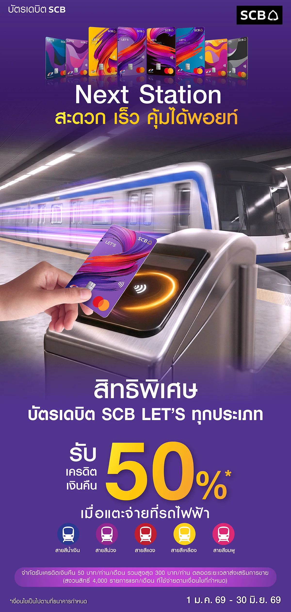 กับบัตรเดบิต SCB เมื่อแตะจ่าย ที่รถไฟฟ้า สายสีน้ำเงิน สายสีม่วง สายสีแดง สายสีเหลือง และสายสีชมพู