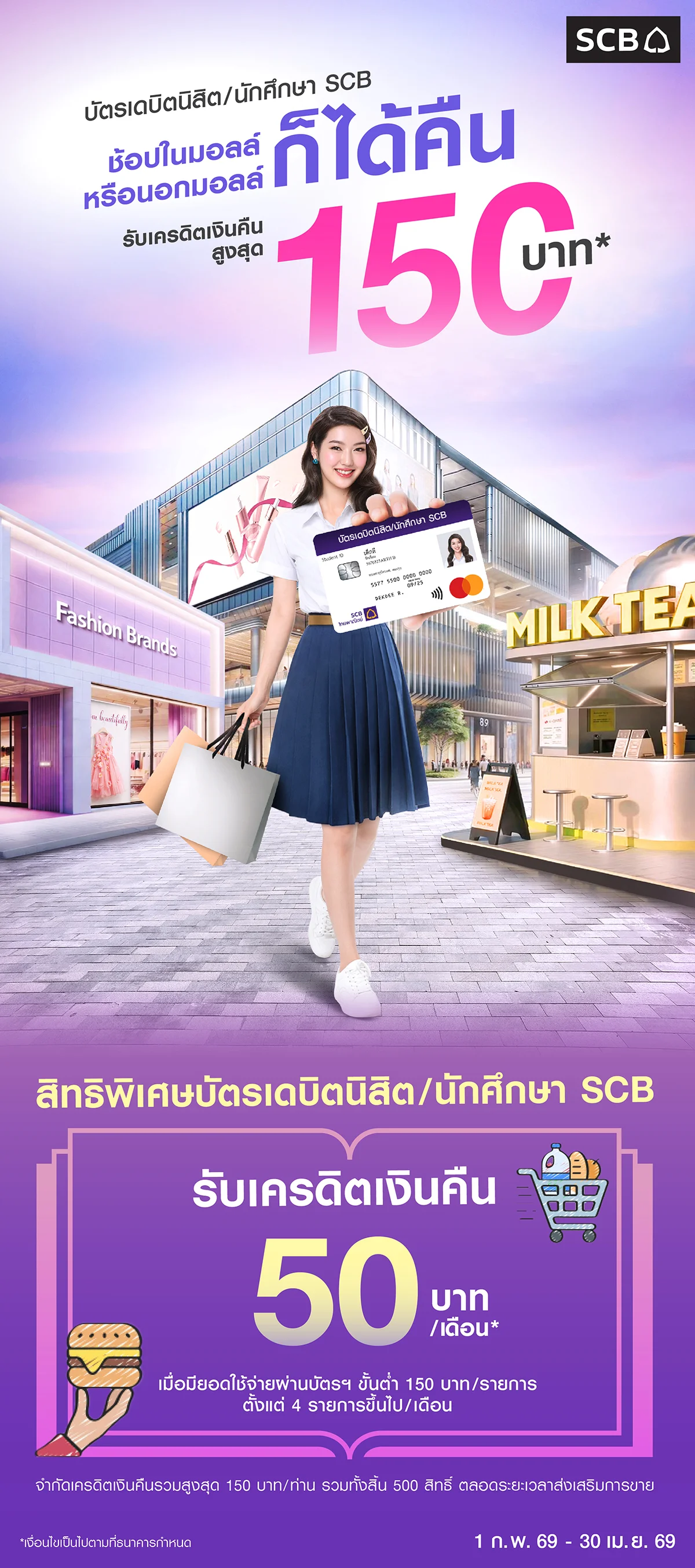 เฉพาะลูกค้าใหม่บัตรเดบิตนิสิต/นักศึกษา SCB ที่ออกบัตรใหม่ครั้งแรกตั้งแต่ 1 ม.ค. 68