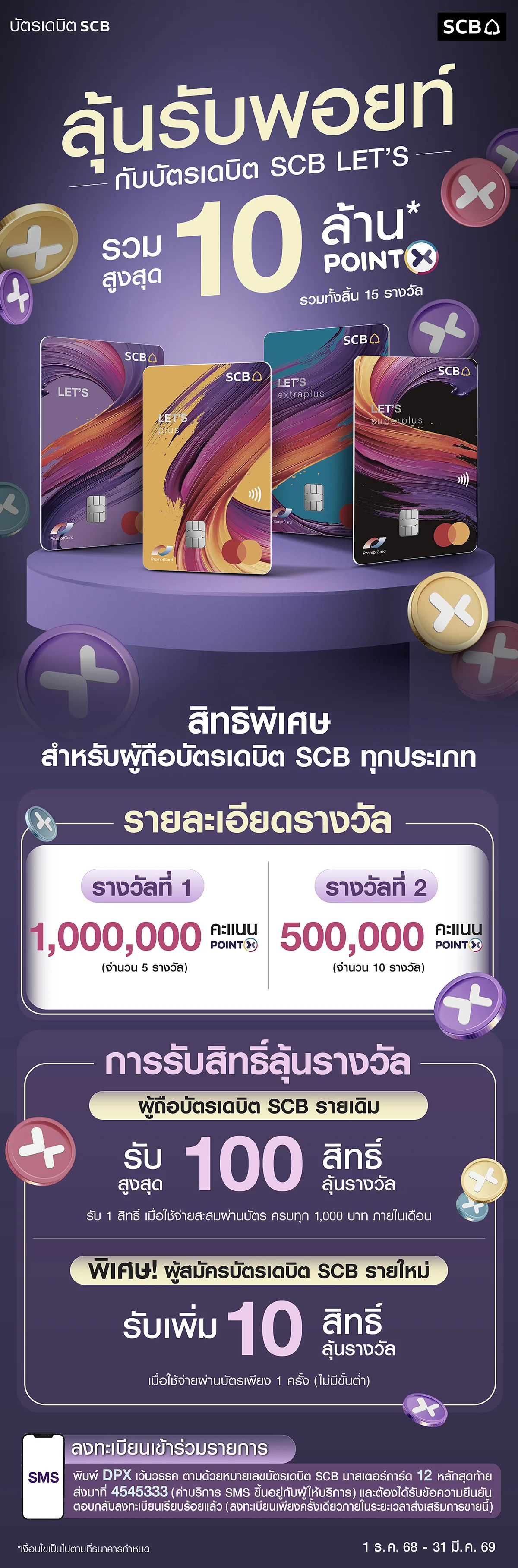 รายการส่งเสริมการขาย บัตรเดบิต SCB LET’S จัดใหญ่ แจก 10,000,000 คะแนน POINTX*