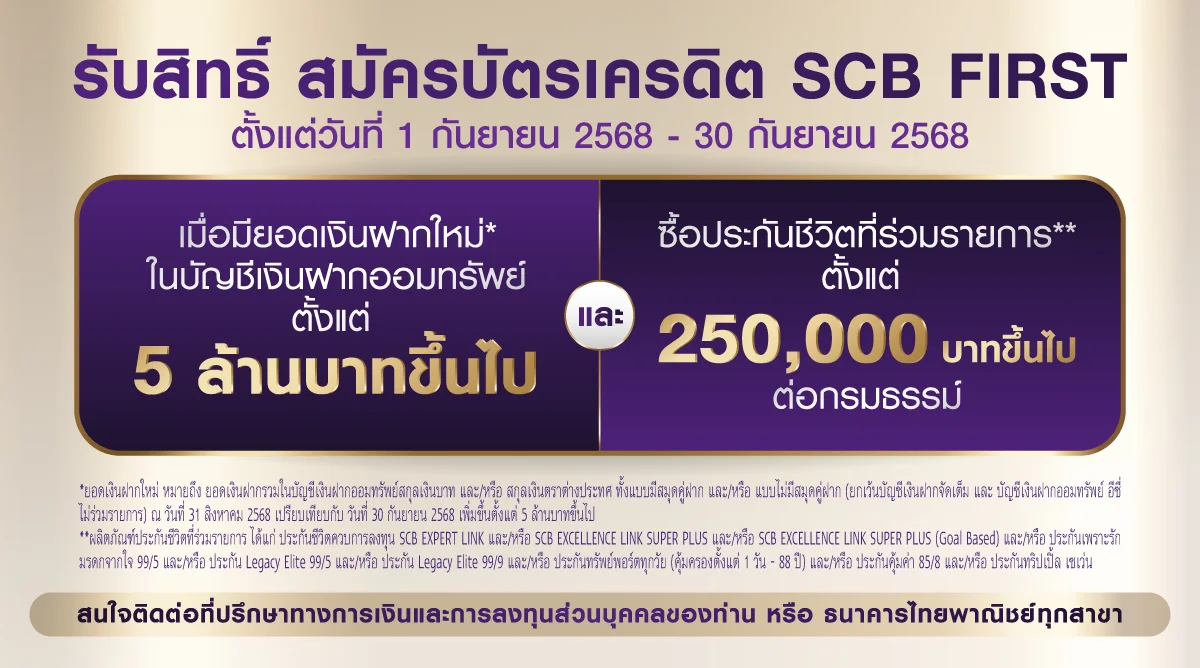 ข้อกำหนดและเงื่อนไขรายการส่งเสริมการขาย Drive Your Wealth Forward รับสิทธิ สมัครบัตรเครดิต SCB FIRST อายุบัตร 2 ปี