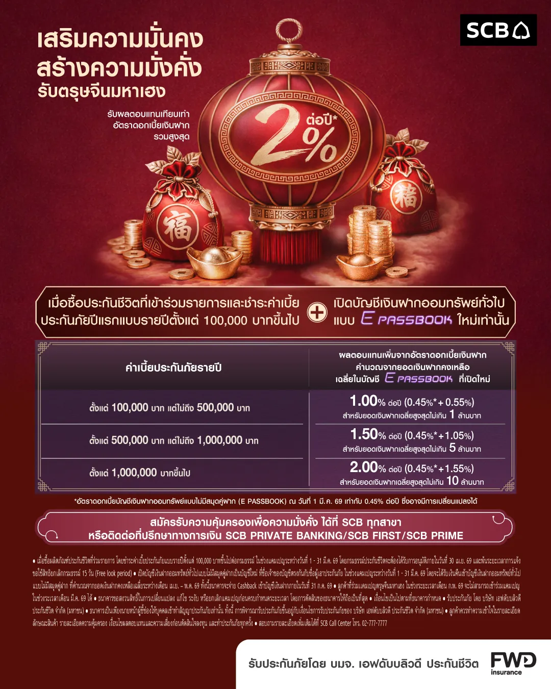เมื่อซื้อประกันชีวิตที่เข้าร่วมรายการและชำระค่าเบี้ยประกันภัยปีแรกแบบรายปีตั้งแต่ 100,000 บาทขึ้นไปพร้อมกับเปิดบัญชีเงินฝากออมทรัพย์ทั่วไปแบบ E PASSBOOK ใหม่เท่านั้น รับผลตอบแทนเทียบเท่าอัตราดอกเบี้ยเงินฝากรวมสูงสุด 2% ต่อปี*