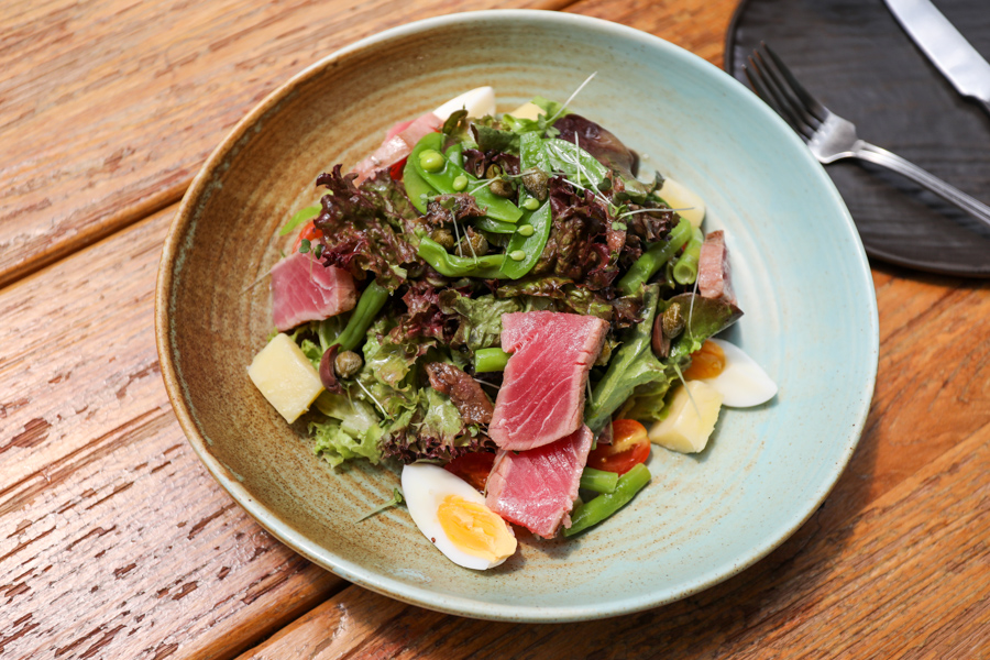 เริ่มต้นเรียกน้ำย่อยกันด้วย Niçoise Salad สลัดผักสดสำหรับคนรักสุขภาพที่เชฟได้พิถีพิถันคัดสรรวัตถุดิบคุณภาพ ทั้งเนื้อปลาทูน่าสดที่นำมานาบกระทะเพื่อให้ผิวด้านนอกสุกเล็กน้อย (Pan-seared) ผักสลัดต่างๆ มันฝรั่ง ถั่วหวาน มะกอกดำ มะเขือ เคเปอร์ ปลาแอนโชวี่ ไข่ต้ม และมัสตาร์ดเดรซซิ่ง สลัดจานนี้ช่วยเรียกความสดชื่นได้ดี เหมาะกับเป็น Starter เบาๆ ก่อนเริ่มเมนูต่อไป