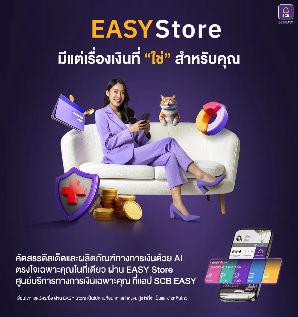 EASY Store ไม่ใช่แค่ฟีเจอร์ที่รวมผลิตภัณฑ์และบริการไว้ในที่เดียว แต่เป็นพื้นที่ที่แนะนำข้อเสนอที่ “ใช่” สำหรับคุณ ช่วยให้คุณวางแผนทางการเงินได้ดีและฉลาดมากยิ่งขึ้น ง่าย สะดวก ครบ จบในที่เดียว