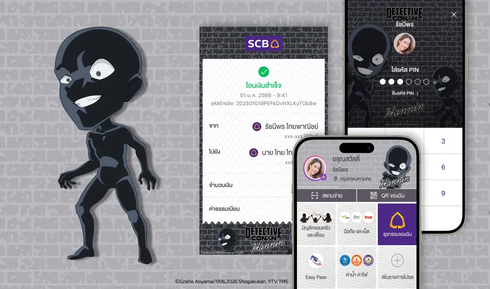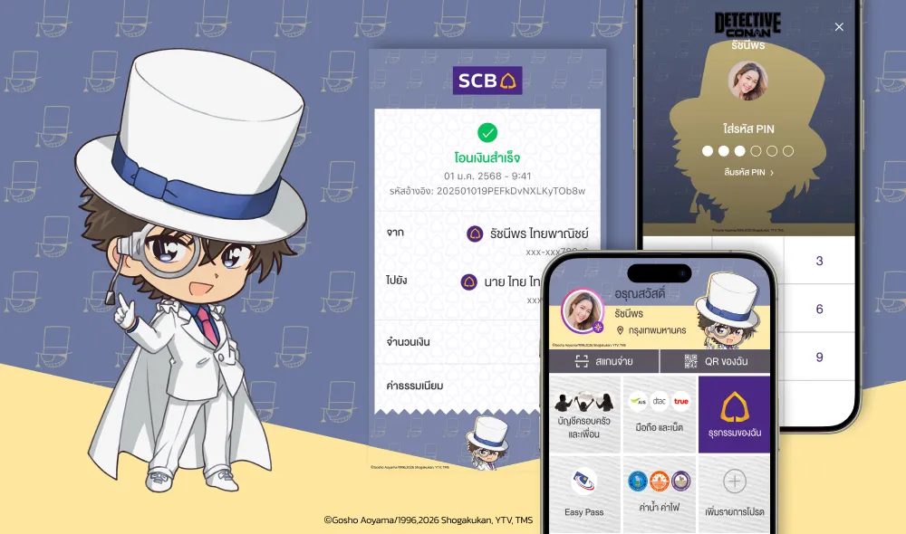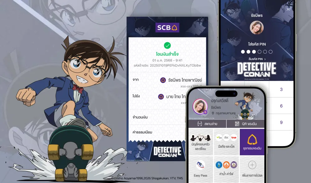 บอกเลยว่าแฟนตัวจริงไม่ควรพลาด เปลี่ยนหน้าจอแอป SCB EASY และสลิปโอนเงินของคุณให้เป็นโลกแห่งการสืบสวน อนิเมะครบรอบ 30 ปีทั้งที ก็ต้องมีธีม ยอดนักสืบจิ๋วโคนันบนแอป SCB EASY ไขปริศนาธีมใหม่! มีอะไรบ้าง ไปดูกันเลย