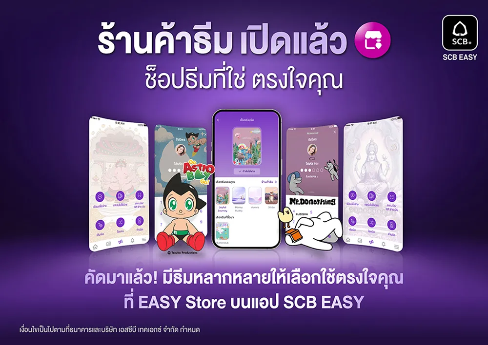 หน้าจอมือถือเป็นหนึ่งในพื้นที่สะท้อนตัวตน (Self-Expression) ของผู้ใช้แต่ละคนได้เป็นอย่างดี วันนี้แอป SCB EASY จะเปลี่ยนการทำธุรกรรมและทุกการโอนของคุณ ให้กลายเป็นงานศิลป์ ผ่าน “ร้านค้าธีม” ที่รวมผลงานของเหล่าศิลปินดังมาไว้บนหน้าจอแอป SCB EASY ของคุณ