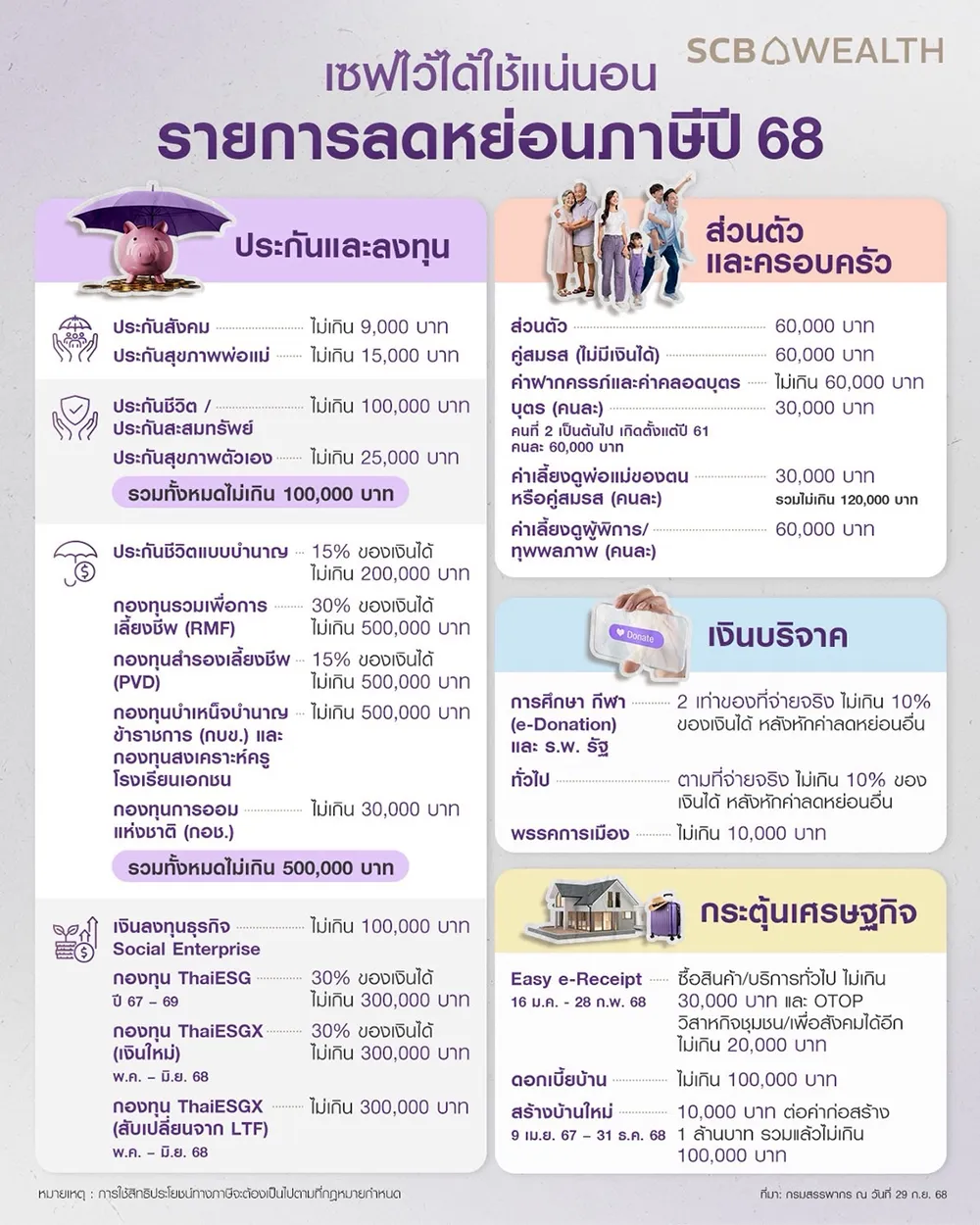 SCB WEALTH ได้รวบรวมรายการลดหย่อนภาษีปี 2568 มาให้คุณไว้เช็กครบในที่เดียว เพื่อช่วยให้การวางแผนภาษีเป็นเรื่องง่ายและใช้ได้จริง เซฟไว้เลย ได้ใช้แน่นอน!