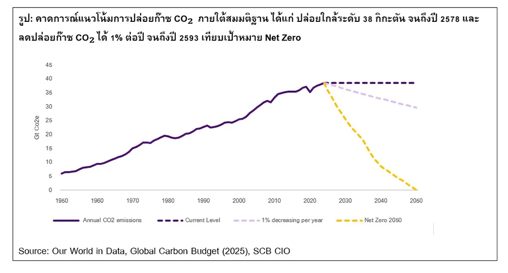 สำนักงานพลังงานระหว่างประเทศ (IEA) คาดการณ์ว่า หากยังอยู่ภายใต้รูปแบบนโยบายปัจจุบัน (Current Policies Scenario: CPS) การปล่อยก๊าซ CO₂ จะยังอยู่ใกล้เคียงระดับ 38 กิกะตัน จนถึงปี 2578 และต่อให้นานาประเทศบรรลุเป้าหมายตามนโยบายที่มี ไม่ว่าจะมีการบังคับใช้แล้วหรือไม่ (stated policies scenario: STEPS) ก็จะลดการปล่อยก๊าซ CO₂ ได้แค่ 1% ต่อปี ไปจนถึงปี 2593 ซึ่งห่างไกลจากเป้าหมาย Net Zero ค่อนข้างมาก และปี 2568 ยังมีความท้าทายเพิ่มเติม จากนโยบายการค้าและภาษี ที่ทำให้ต้นทุนการผลิตสูงขึ้น ส่งผลกระทบต่อห่วงโซ่อุปทาน และจากการเติบโตของกระแสปัญญาประดิษฐ์ (AI) และ Data Center ที่มีแนวโน้มผลักดันความต้องการใช้ไฟฟ้าทั่วโลกเติบโตเกือบ 10% ภายในปี 2573