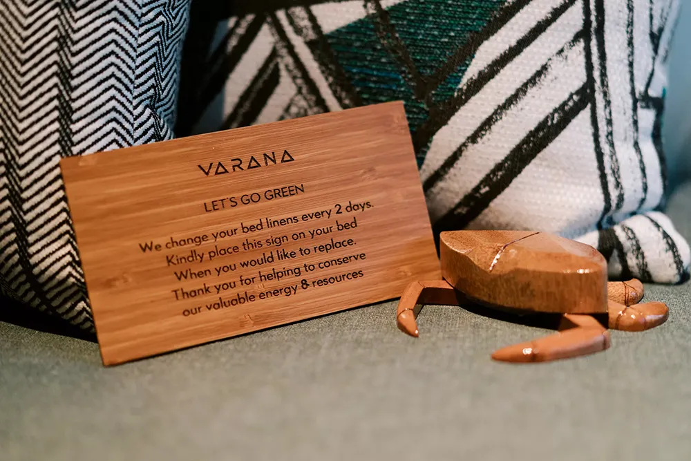 VARANA Krabi Hotel นิยามการพักผ่อนให้เชื่อมโยงกับสิ่งแวดล้อมอย่างแท้จริง ทุกมิติถูกออกแบบให้ยั่งยืน ตั้งแต่การลดการใช้พลังงานและเชื้อเพลิง ติดตั้งพลังงานหมุนเวียน และดัดแปลงตุ๊กตุ๊กเก่าให้วิ่งด้วยไฟฟ้า ไปจนถึงการจัดการน้ำด้วยธนาคารน้ำใต้ดิน ขยะอาหารไม่ถูกทิ้งไปอย่างเปล่าประโยชน์ แต่ถูกแปรรูปเป็นปุ๋ย ตัดวงจรก๊าซมีเทน ขณะที่ขยะรีไซเคิลถูกส่งต่อให้ผู้รับซื้อ และพลาสติกแบบใช้ครั้งเดียวทิ้งถูกแทนที่ด้วยวัสดุที่นำกลับมาใช้ใหม่ได้