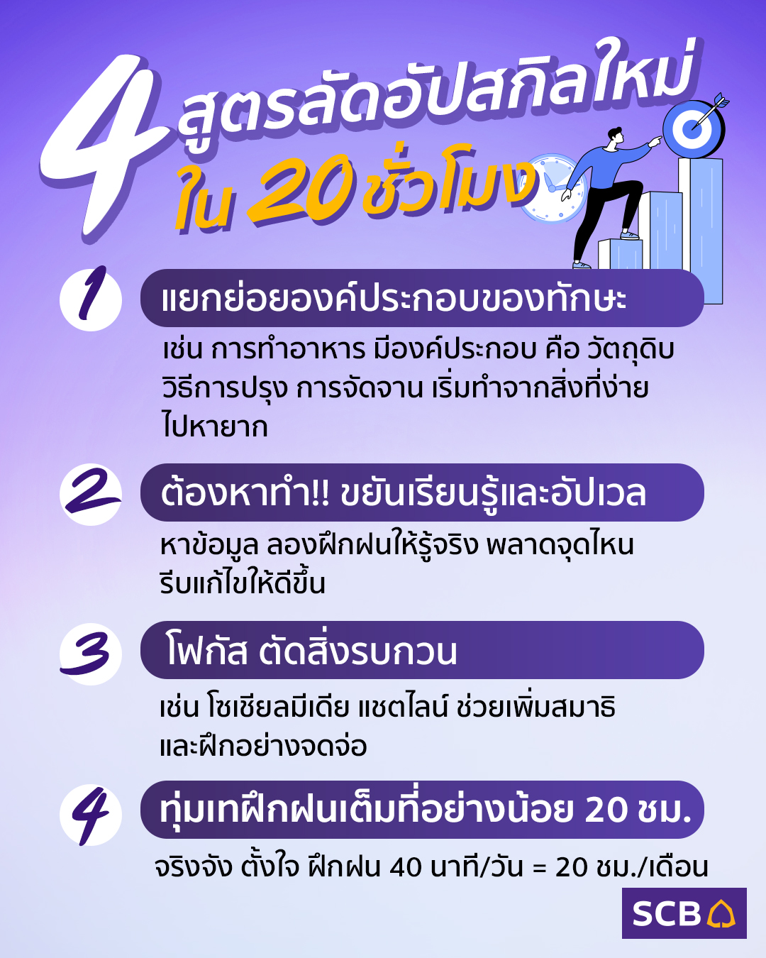 จริงจัง ตั้งใจ ไม่ได้มาเล่นๆ คือ นิยามการฝึกฝนทักษะใหม่ตามกฎ เริ่มตั้งแต่ขั้นตอนแรกจนขั้นตอนสุดท้ายต้องใช้เวลาอย่างน้อย 20 ชั่วโมง แต่คนเราไม่สามารถอดทนต่อสิ่งหนึ่งสิ่งใดได้นานตลอดวัน ดังนั้น ควรแบ่งเวลาในการฝึกฝนให้ได้วันละ 40 นาที เท่านี้ก็สามารถเรียนรู้ได้ครบ 20 ชั่วโมงภายในเวลา 1 เดือนแบบไม่เหนื่อยเกินไป สำหรับการฝึกฝนทักษะในเวลา 20 ชั่วโมง บางคนอาจคิดว่าน้อยมาก แต่หากเราฝึกฝนตาม 4 เทคนิคที่กล่าวมาแล้ว จะสามารถนำทักษะที่ฝึกฝนไปใช้ประโยชน์ได้ ซึ่งหลังจากนั้นหากเรารู้สึกสนใจ และรักที่จะฝึกฝนต่อไป ก็สามารถพัฒนาไปสู่ความเป็นมืออาชีพในทักษะนั้นๆ ได้